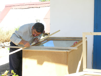 The Kerkenes Eco Center was once again the hub of many activities this year. Completion of the Solar Building was perhaps the most significant achievement. Villagers, local artisans and students from the Department of Architecture at the Middle East Technical University in Ankara helped in the completion of this innovative experimental building (Fig. 15a). Students undertook small projects including the addition of seating, storage areas under the staircase and storage niches beneath the solar space using recycled materials, in addition to making improvements to the mud-brick oven and its chimney. These activities formed part of the "Arch 325: Architecture in situ: Hands on building" elective course. Once completed the solar space at the front of the building was used by village ladies to dry fruit and vegetables (Fig. 15b) and the improved oven inside to make yufka bread and gözleme while solar cookers were again employed in the production of jam.