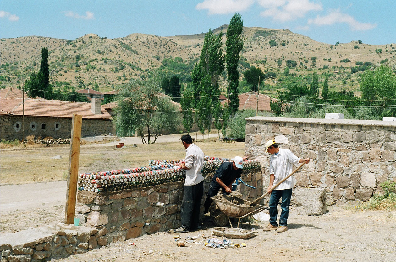 Bottles and cans from drinks consumed during the summer season of archaeological fieldwork are recycled in the garden walls enclosing the expedition house compound.