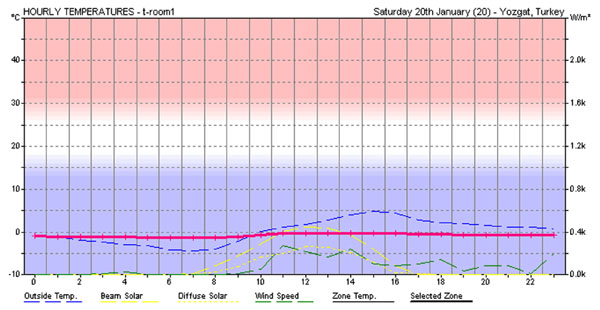 The hourly temperature profile inside the mudbrick building (pink line) on the 20th of January 2004 can displayed in Ecotect v.5.20 against the weather data (5 years average) for Yozgat.