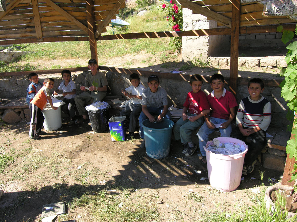Village children are helping sorting the recyling materials Köyden çocuklar geri dönüştürülecek çöplerin ayrıstırılmasına yardım ediyor.