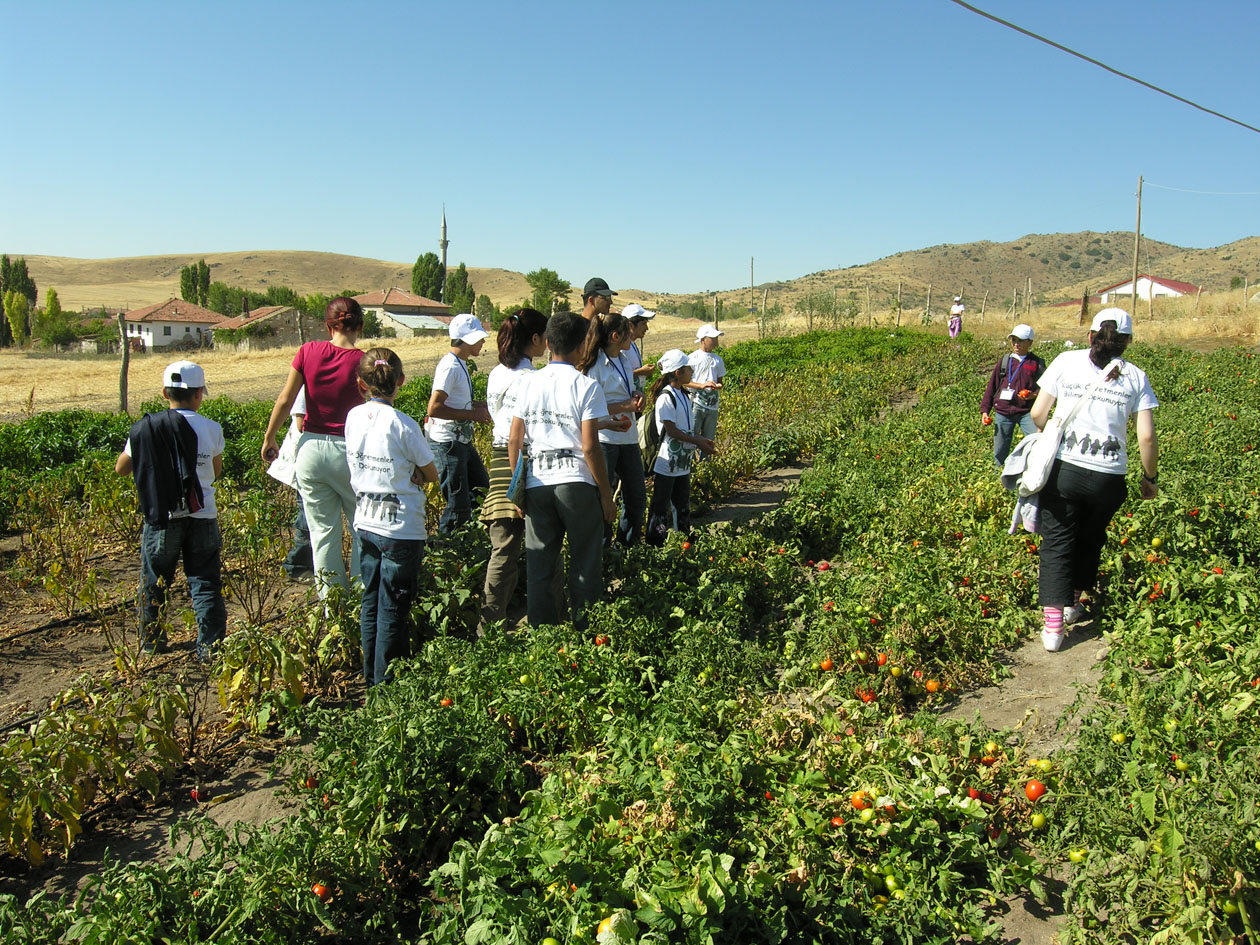 A group of school children from Van visiting the Kerkenes Eco-Center in September 2008 enjoyed picking up tomatoes from the organic garden cultivated by Nizam Erciyas.