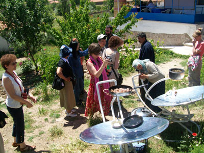 A lady from the village is cooking the meatballs and the filled vine leaves using the solar cookers... Bir köylü kadın güneş ocağında köfte ve sarma pişirirken....
