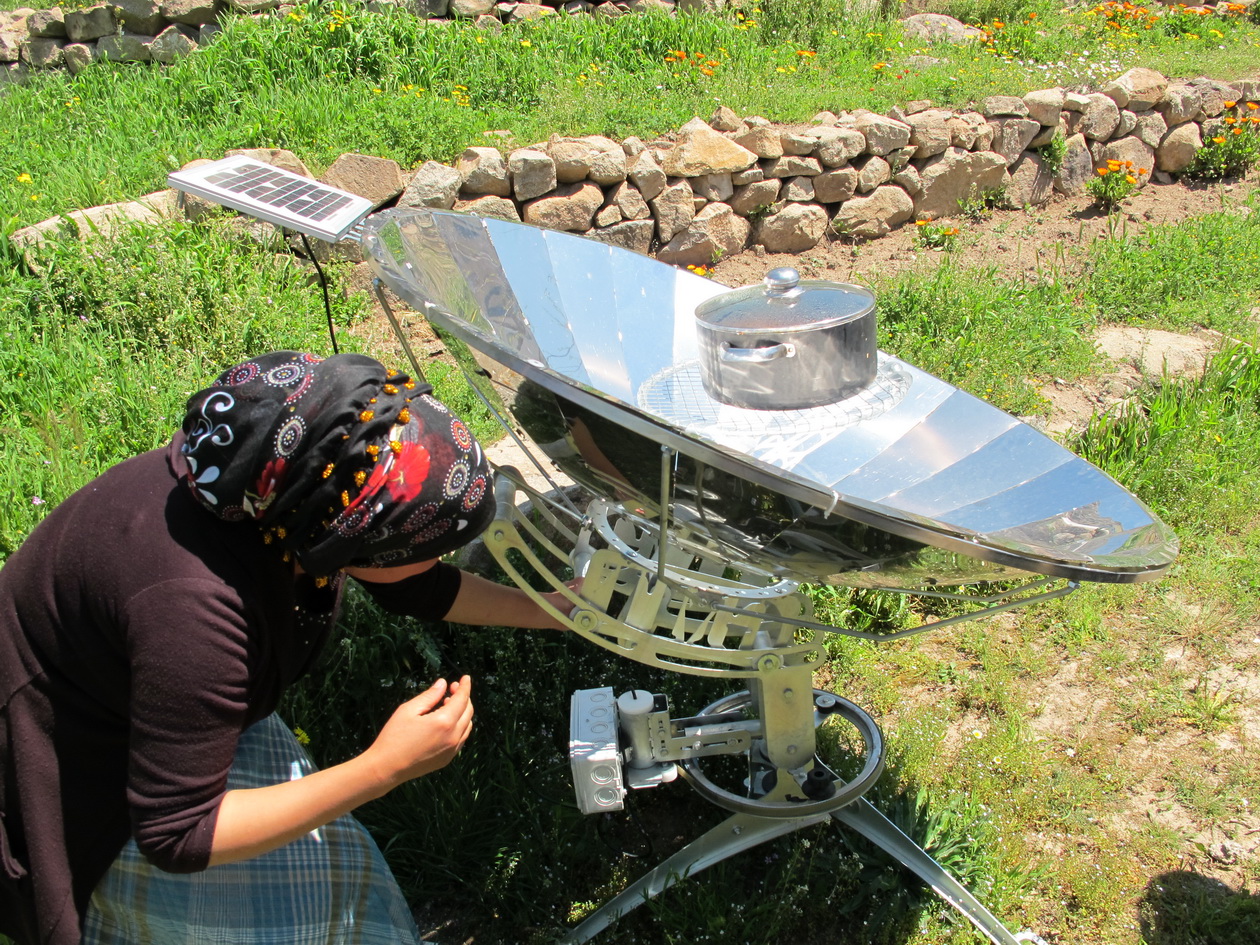 Adjusting the motorized solar cooker.