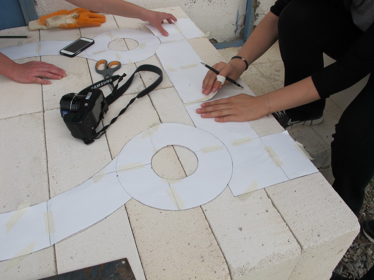 Using a paper template to mark to the shape of replicated stele for cutting.
