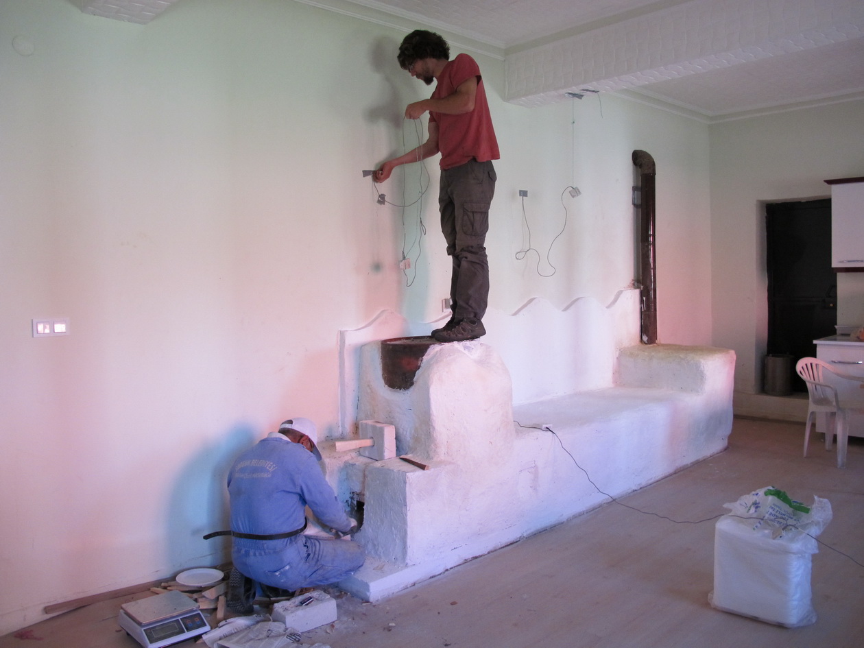 Putting the finishing touches to the rocket stove in the school kitchen.
