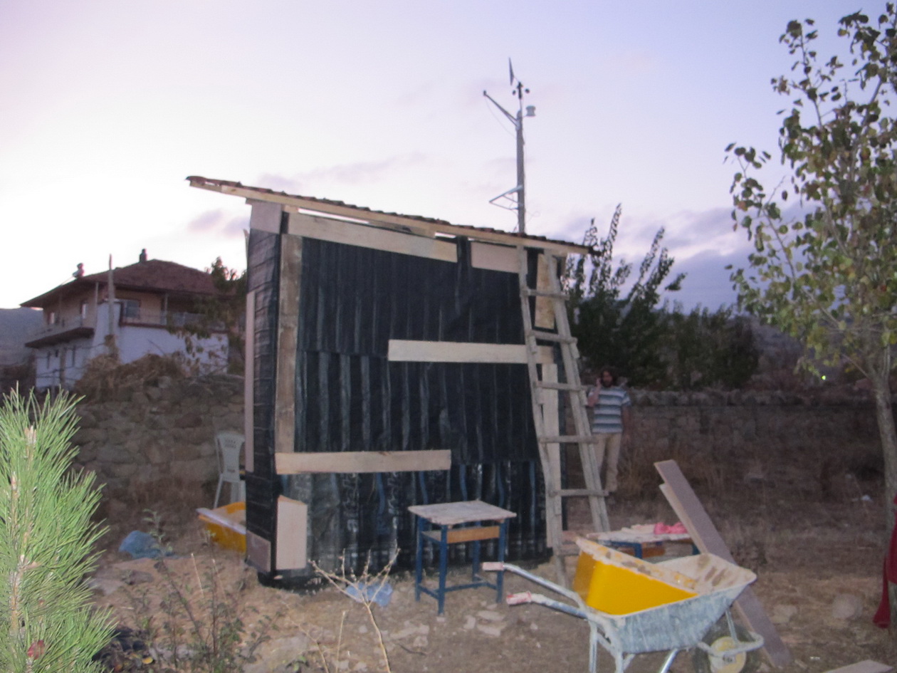 Straw-bale wall is plastered and equipped with sensors.