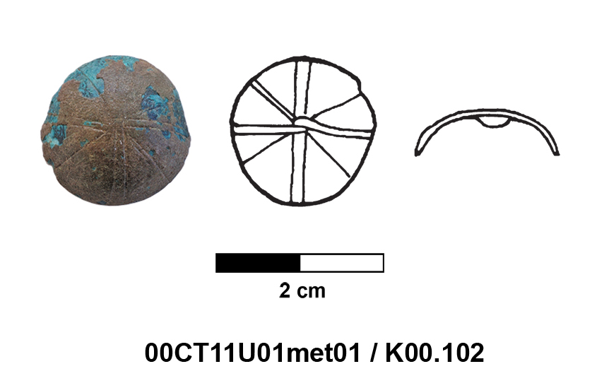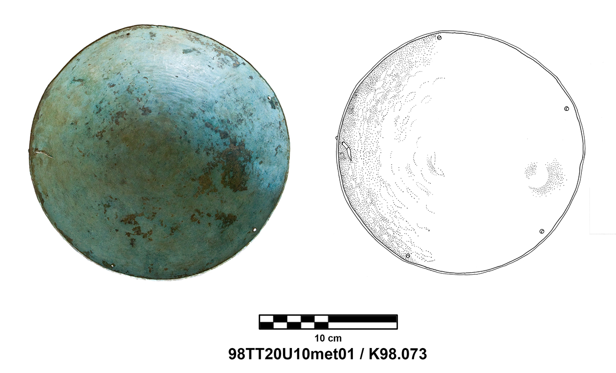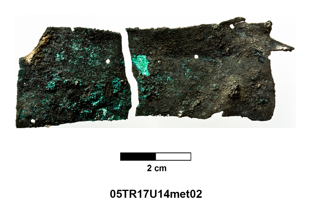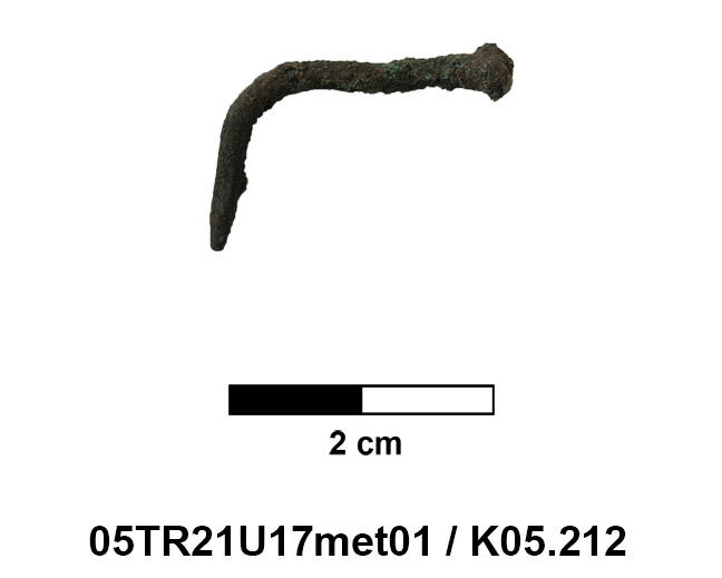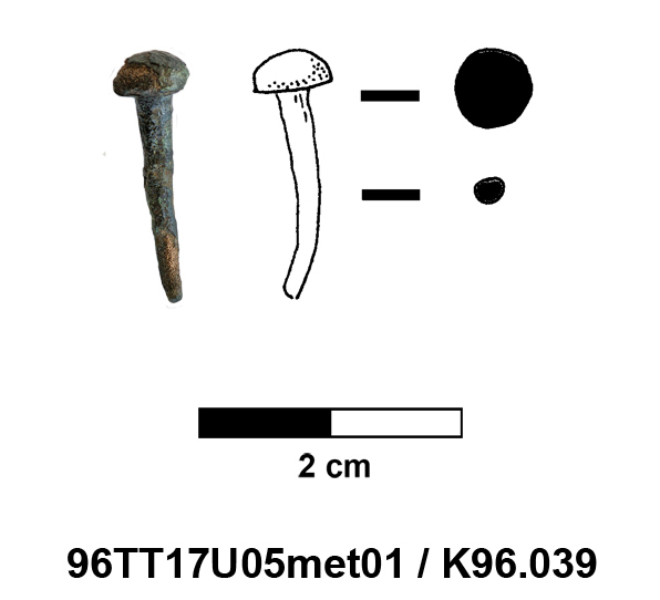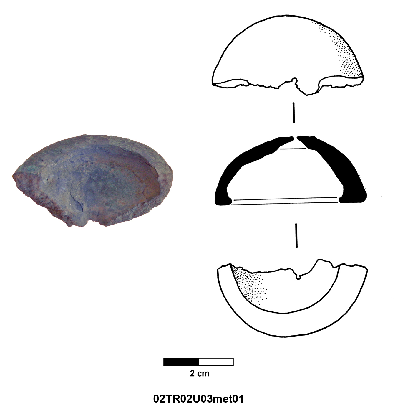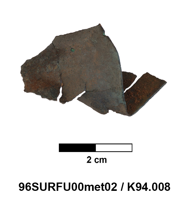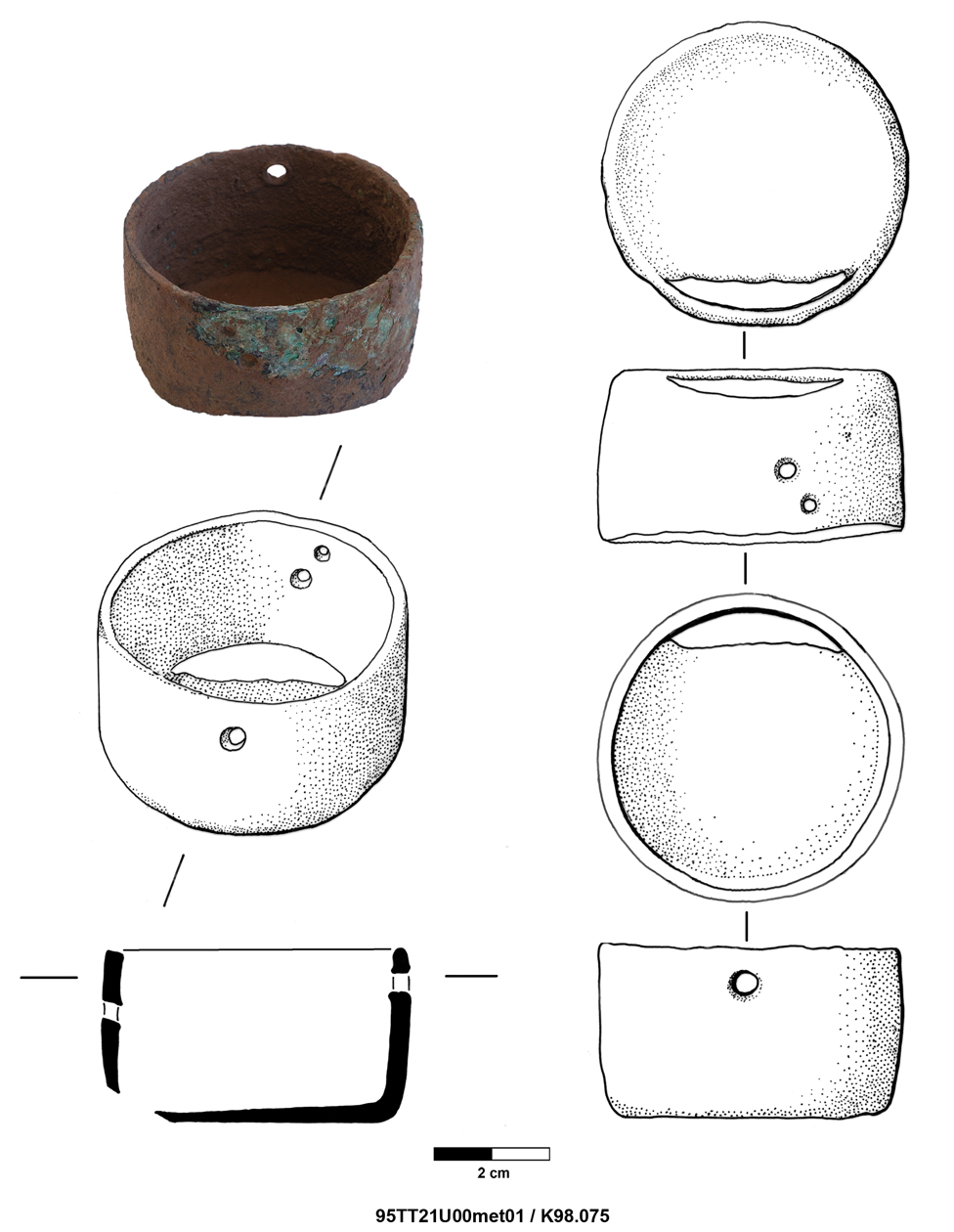 Bowl-shaped copper alloy object with 5 holes and one extant bent nail, complete. Highly polished interior and exterior, hammer marks on interior. Original object recut in antiquity, as attested by the sharp rim profile and uneven top. Object appears to have been slightly deformed in this process. 5 secondary holes, each 1 mm diameter, were drilled from the exterior at irregular intervals. One small nail, approx. 2 cm long, remains, point inward and, apparently, intentionally bent. Original object probably had higher walls. Neither original form nor recut function is clear.