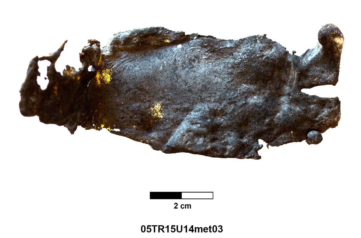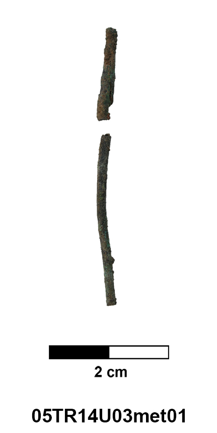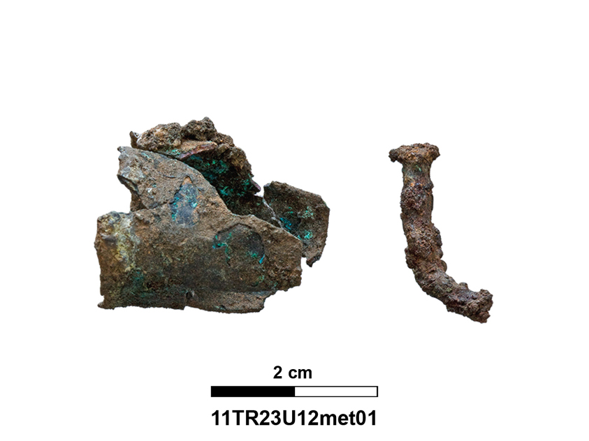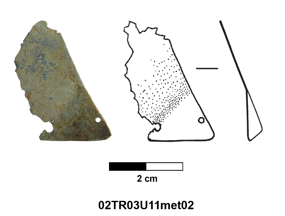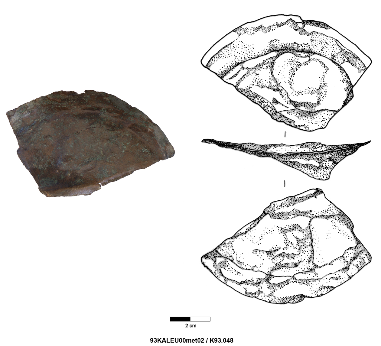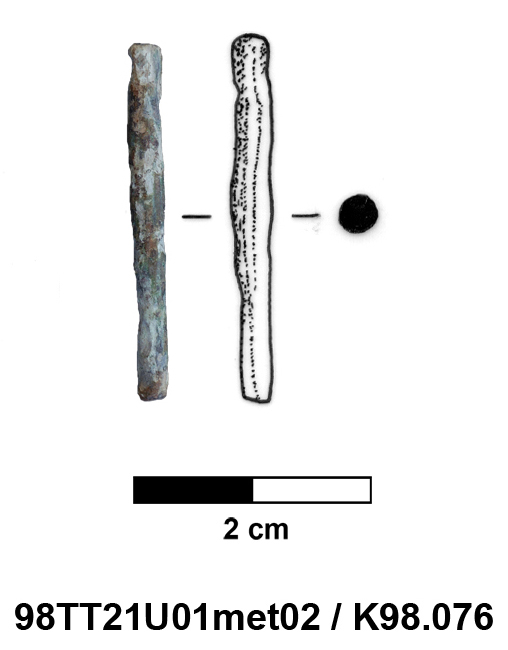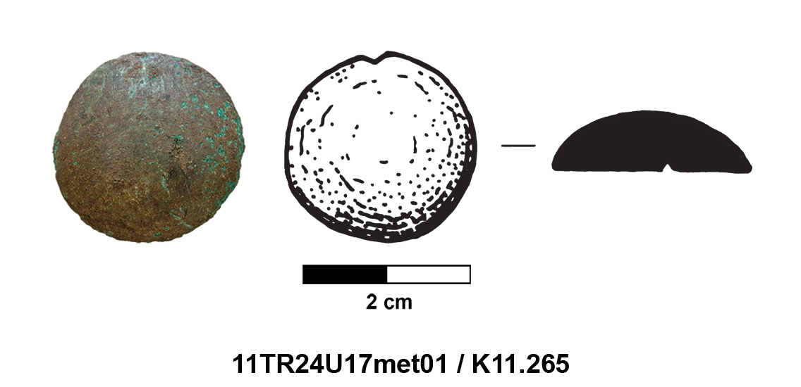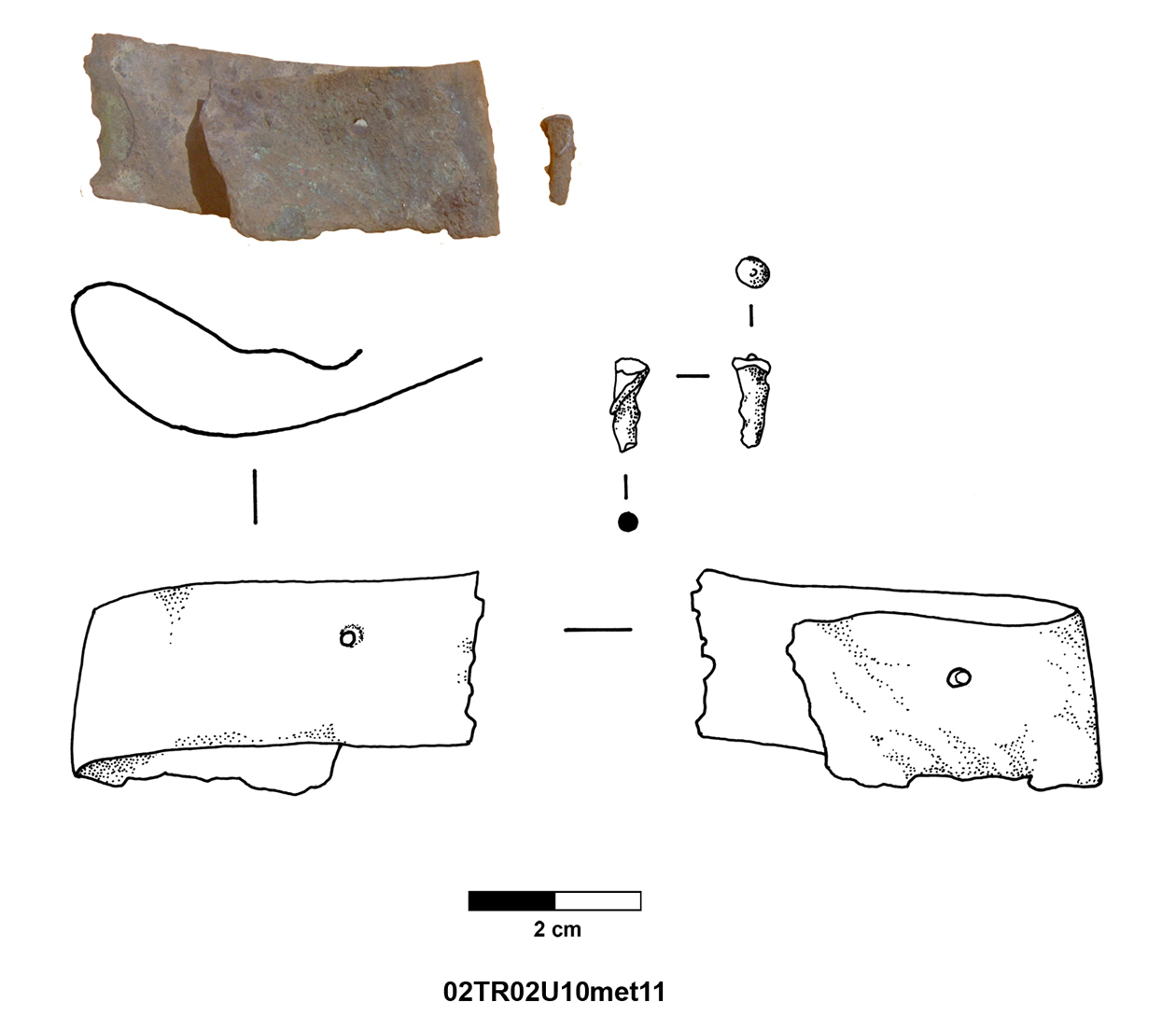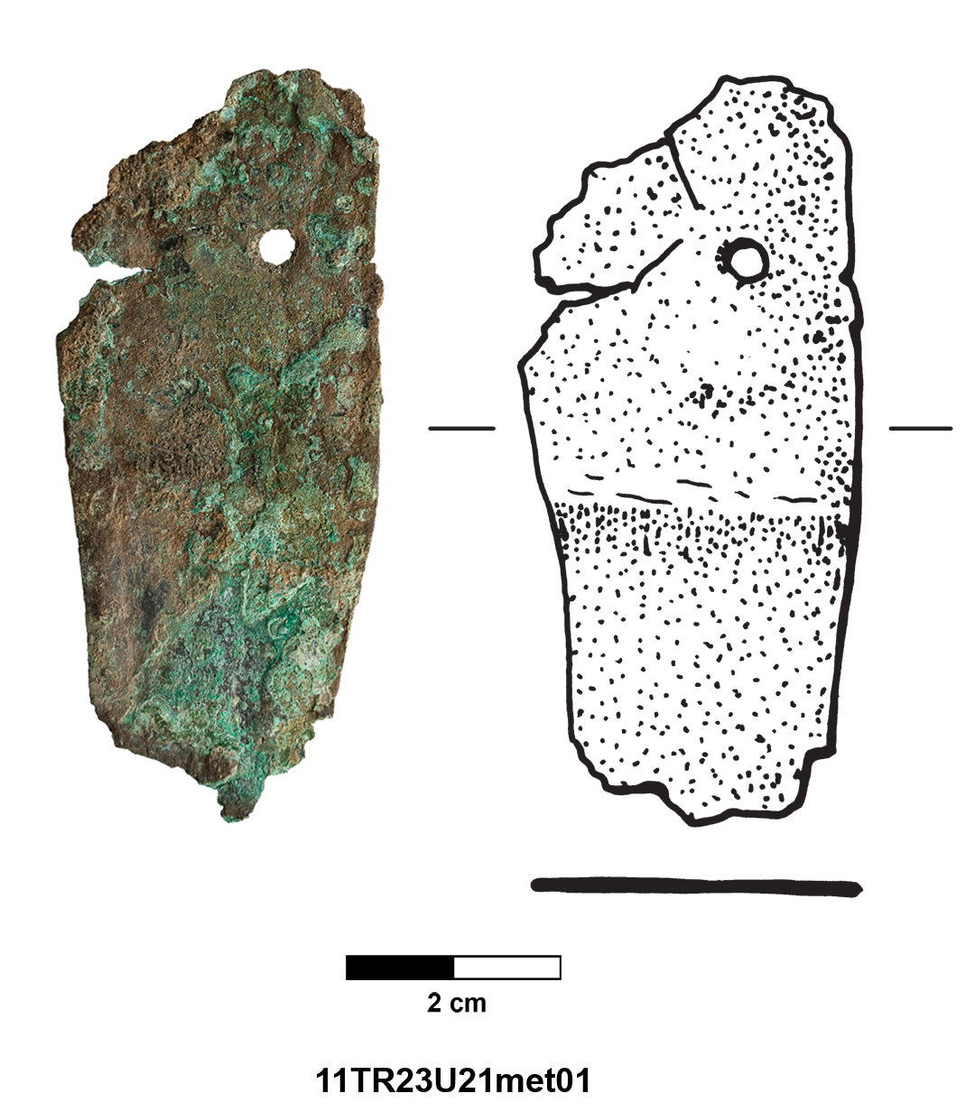 Bowl-shaped copper alloy object with 5 holes and one extant bent nail, complete. Highly polished interior and exterior, hammer marks on interior. Original object recut in antiquity, as attested by the sharp rim profile and uneven top. Object appears to have been slightly deformed in this process. 5 secondary holes, each 1 mm diameter, were drilled from the exterior at irregular intervals. One small nail, approx. 2 cm long, remains, point inward and, apparently, intentionally bent. Original object probably had higher walls. Neither original form nor recut function is clear.