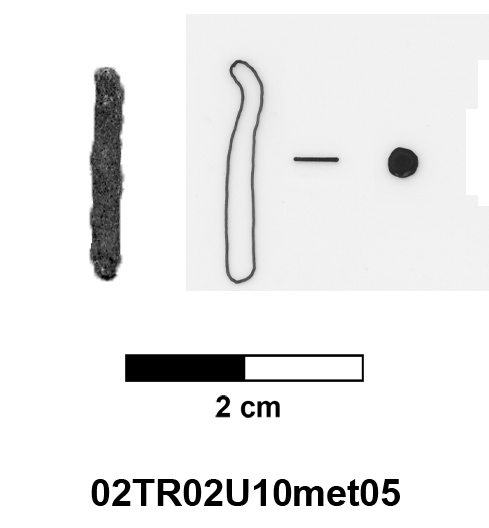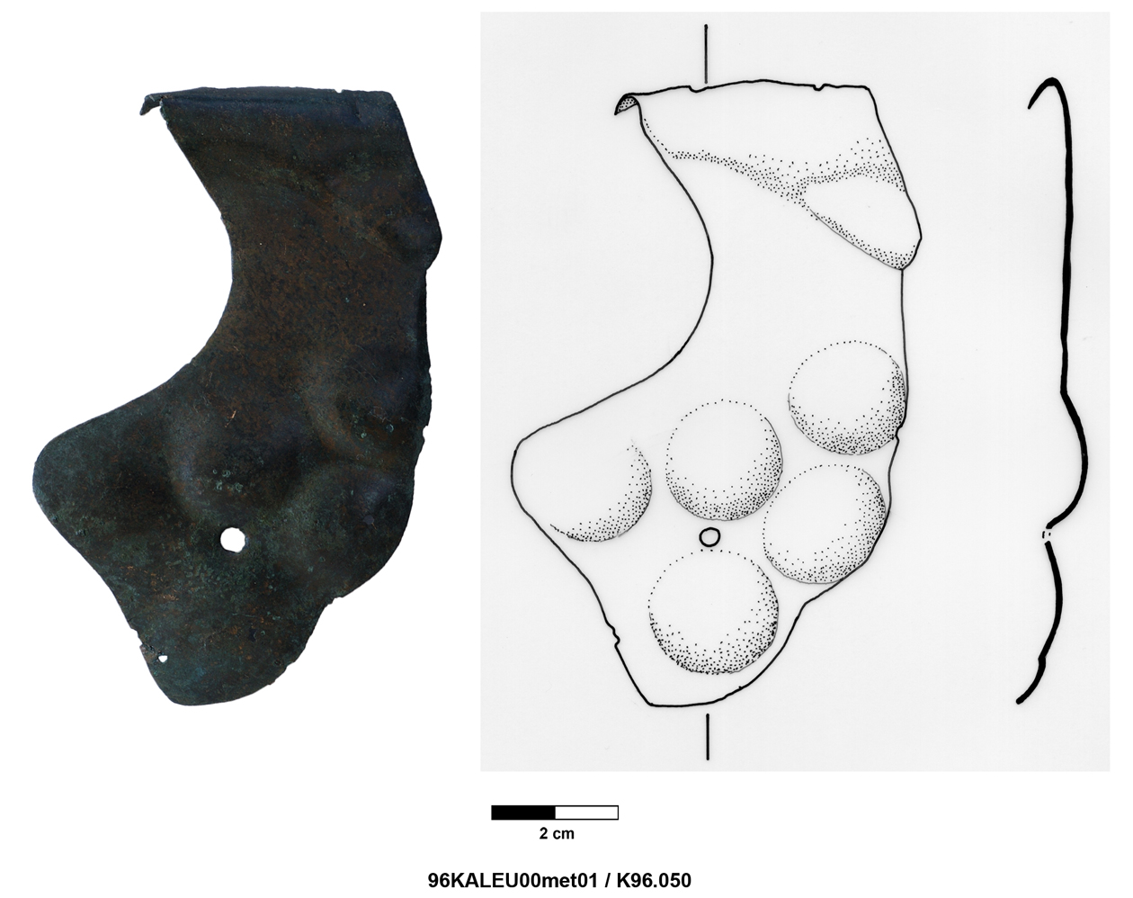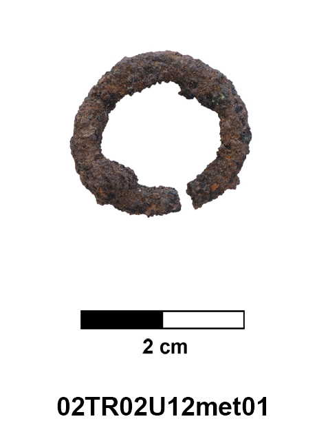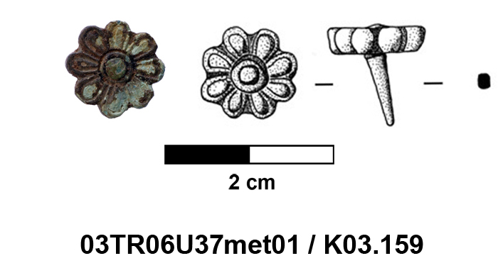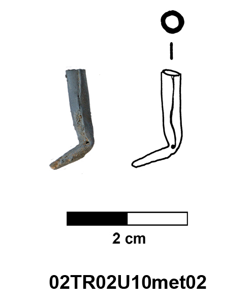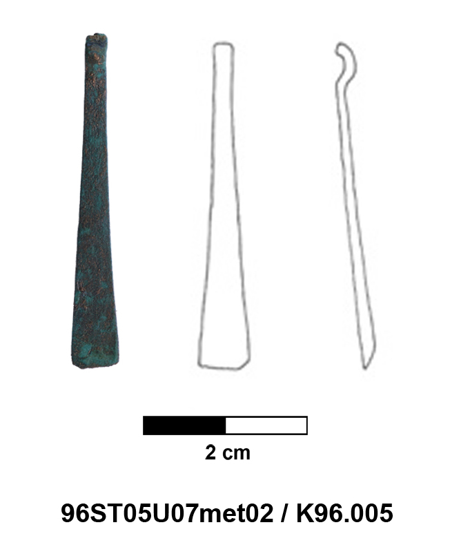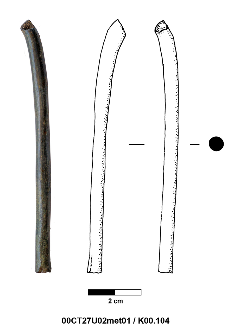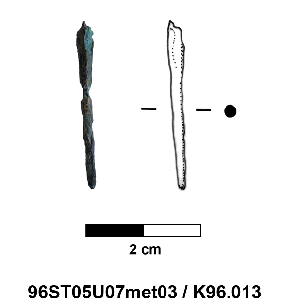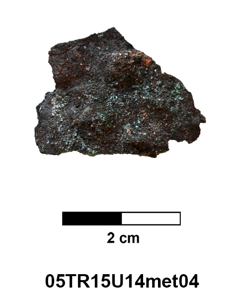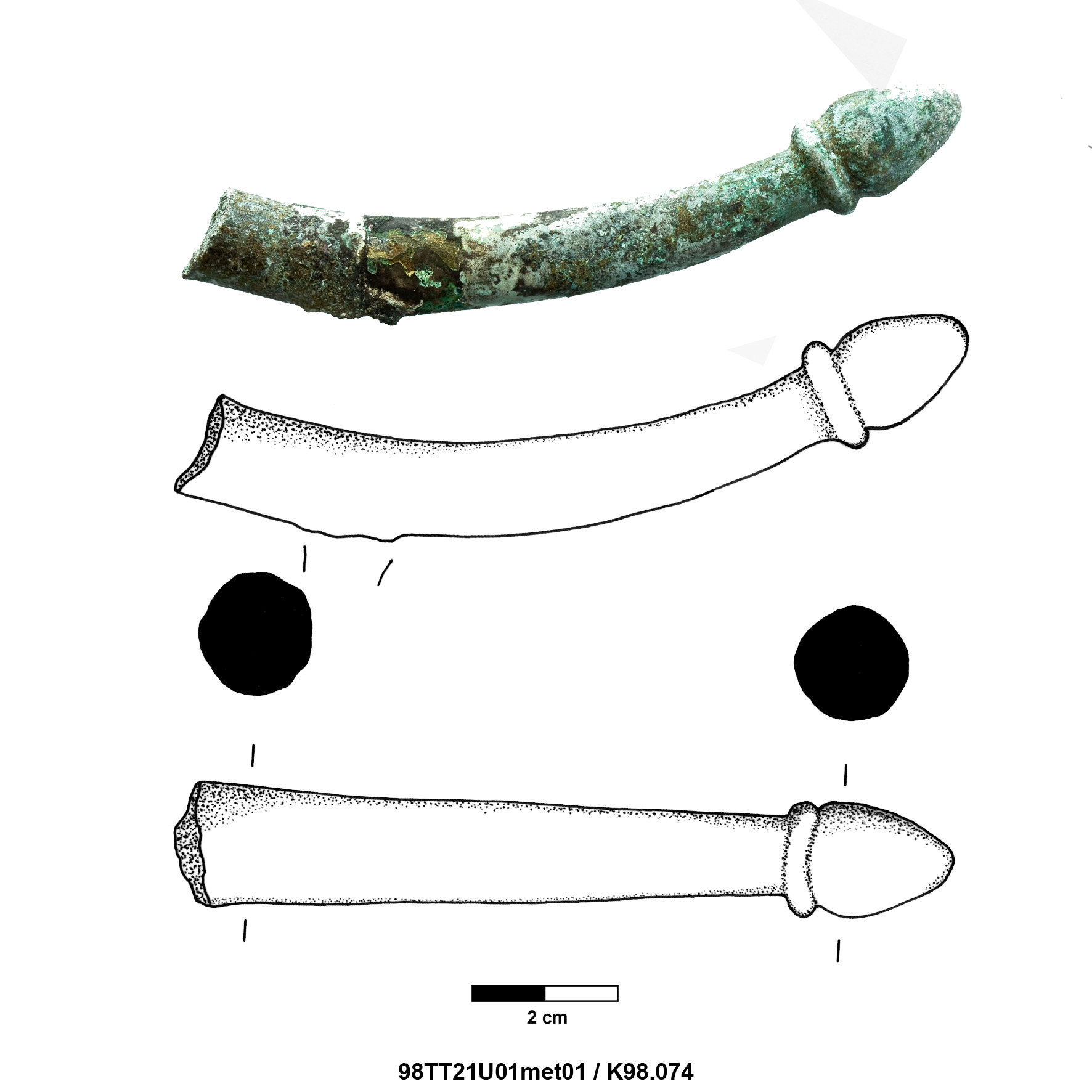 Bowl-shaped copper alloy object with 5 holes and one extant bent nail, complete. Highly polished interior and exterior, hammer marks on interior. Original object recut in antiquity, as attested by the sharp rim profile and uneven top. Object appears to have been slightly deformed in this process. 5 secondary holes, each 1 mm diameter, were drilled from the exterior at irregular intervals. One small nail, approx. 2 cm long, remains, point inward and, apparently, intentionally bent. Original object probably had higher walls. Neither original form nor recut function is clear.