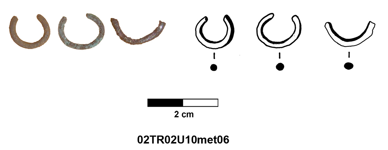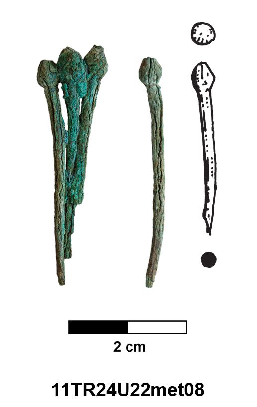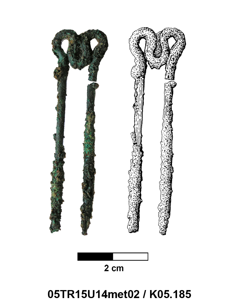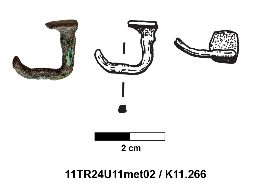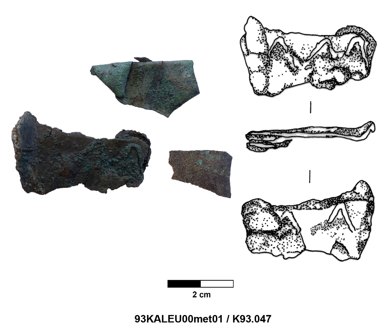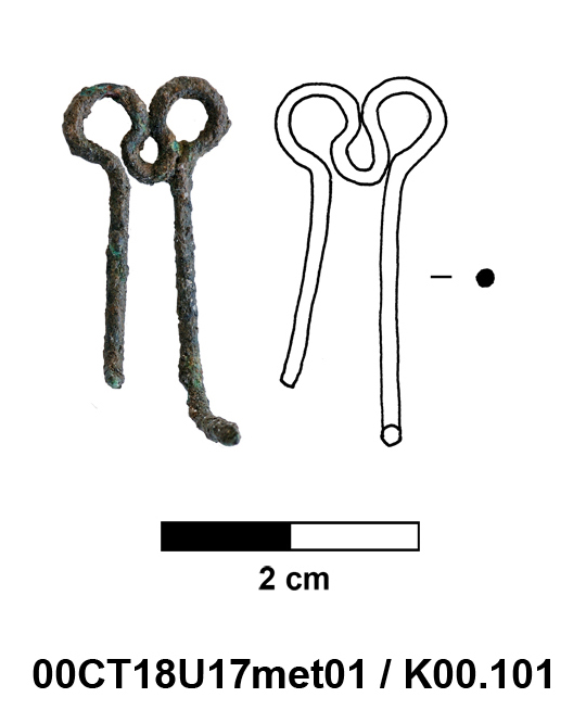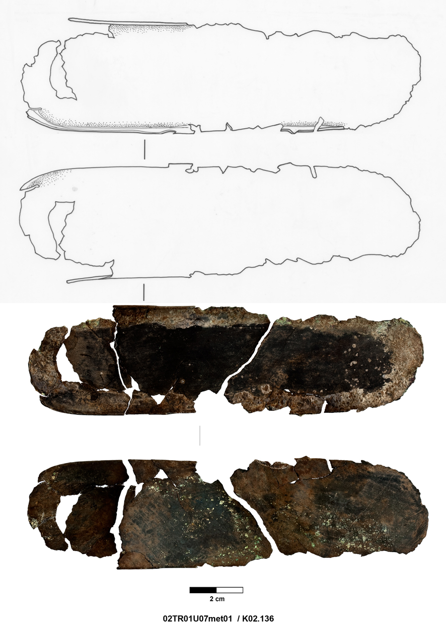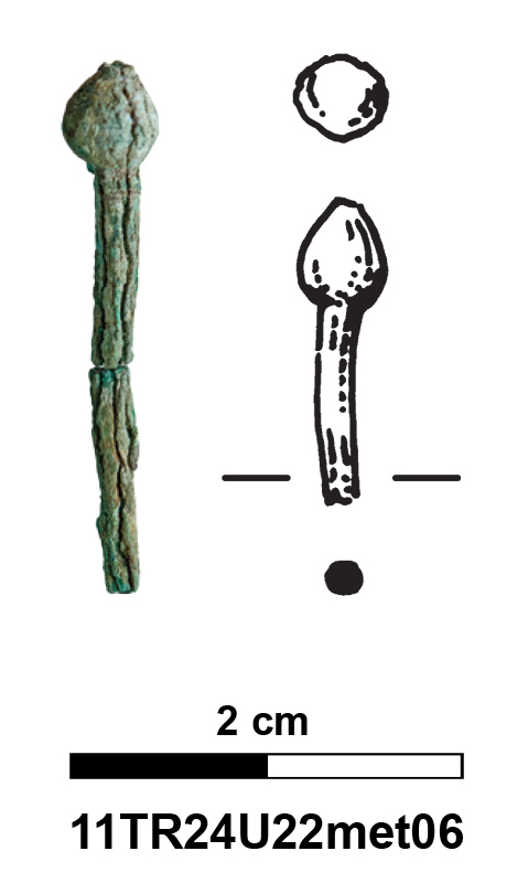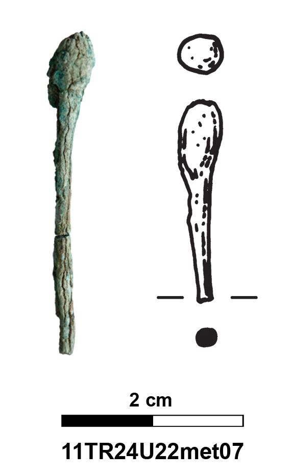 Bowl-shaped copper alloy object with 5 holes and one extant bent nail, complete. Highly polished interior and exterior, hammer marks on interior. Original object recut in antiquity, as attested by the sharp rim profile and uneven top. Object appears to have been slightly deformed in this process. 5 secondary holes, each 1 mm diameter, were drilled from the exterior at irregular intervals. One small nail, approx. 2 cm long, remains, point inward and, apparently, intentionally bent. Original object probably had higher walls. Neither original form nor recut function is clear.