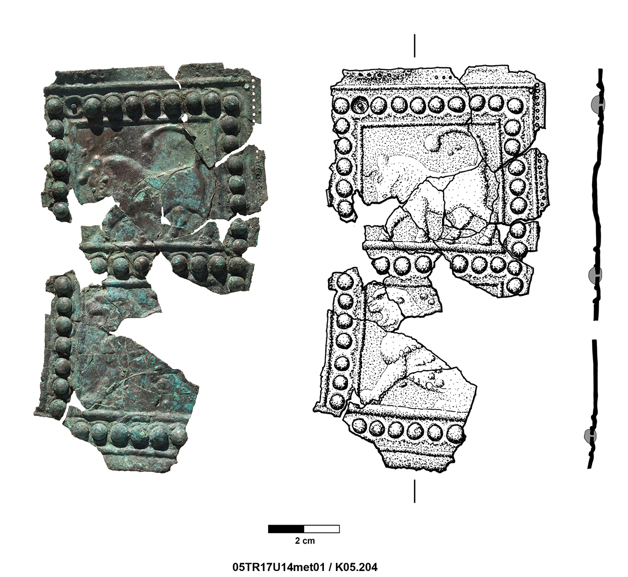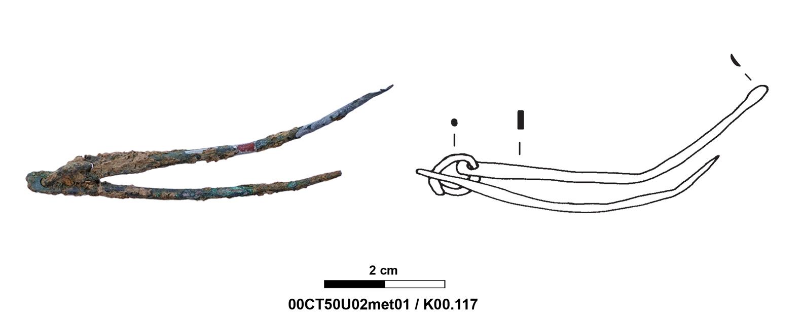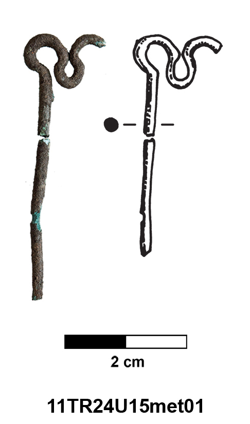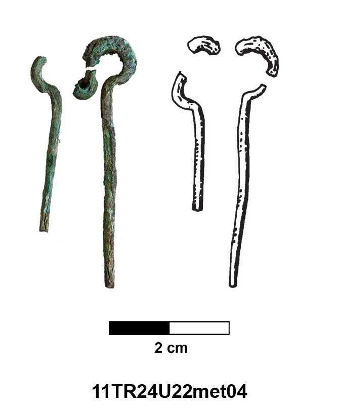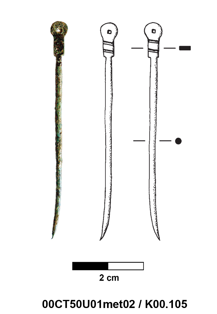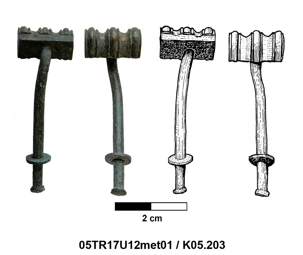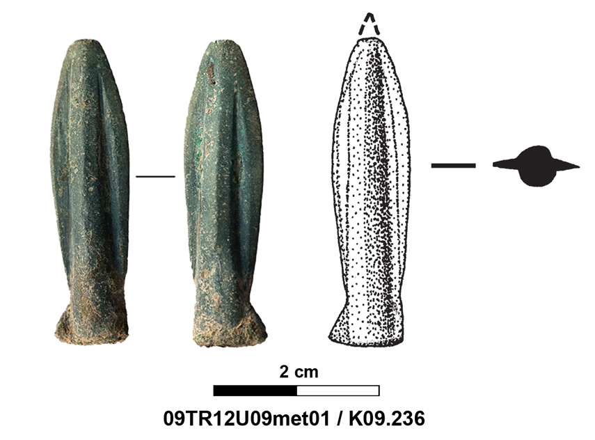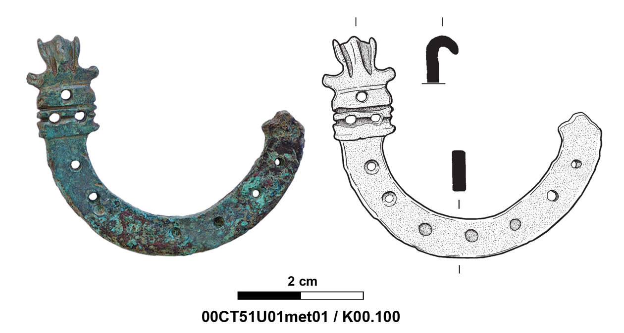 Bowl-shaped copper alloy object with 5 holes and one extant bent nail, complete. Highly polished interior and exterior, hammer marks on interior. Original object recut in antiquity, as attested by the sharp rim profile and uneven top. Object appears to have been slightly deformed in this process. 5 secondary holes, each 1 mm diameter, were drilled from the exterior at irregular intervals. One small nail, approx. 2 cm long, remains, point inward and, apparently, intentionally bent. Original object probably had higher walls. Neither original form nor recut function is clear.
