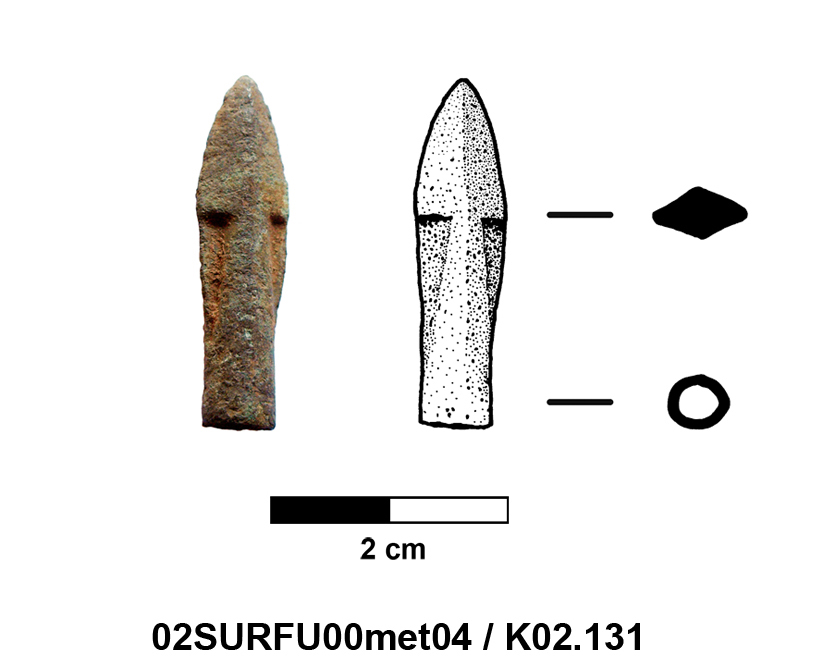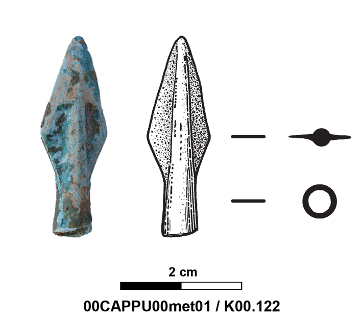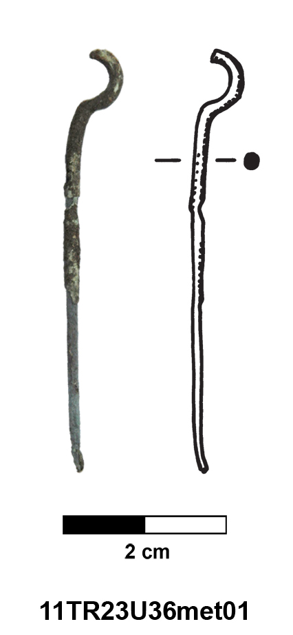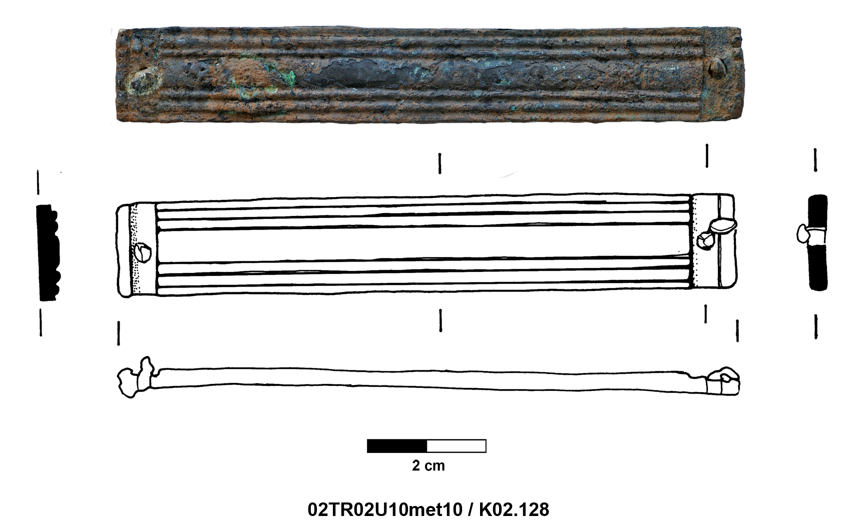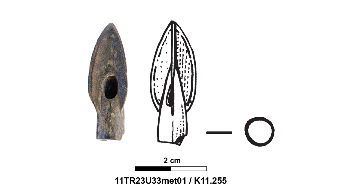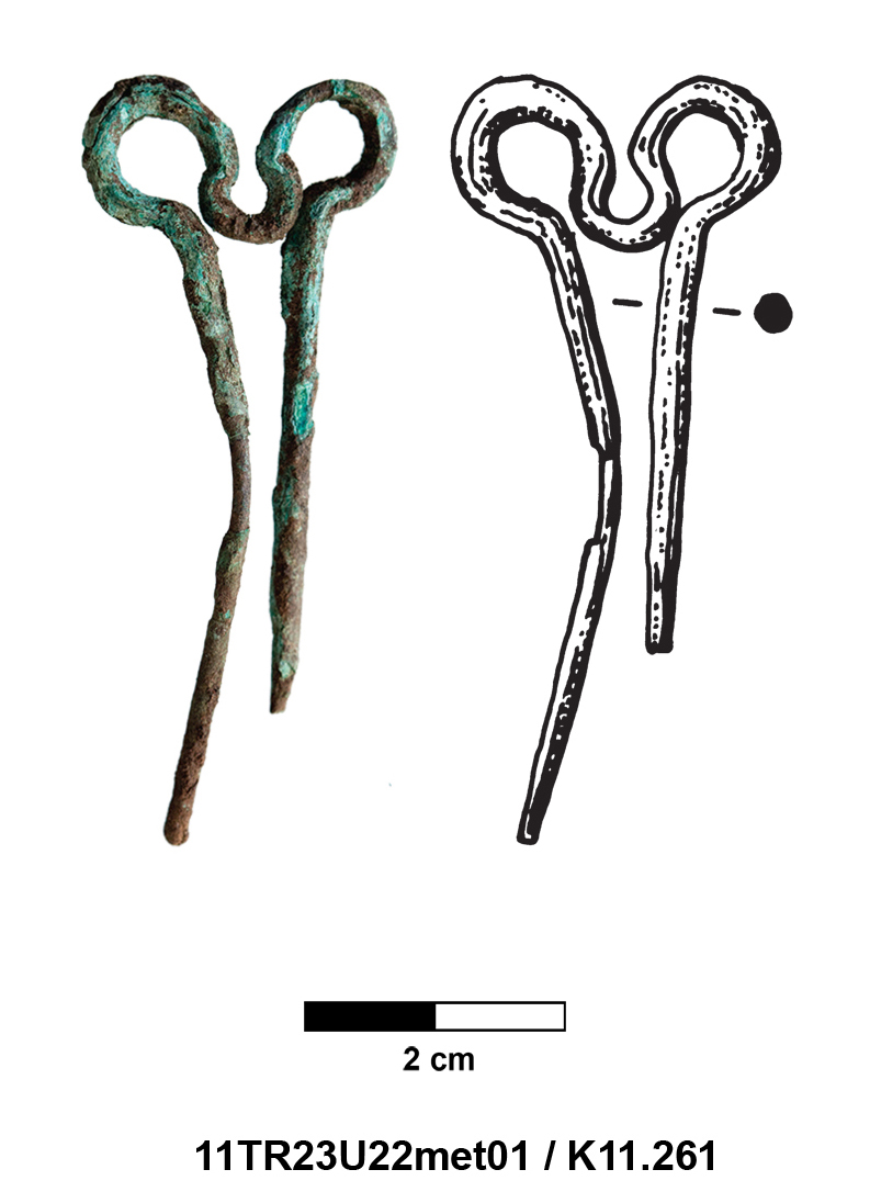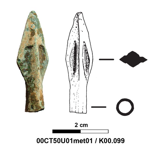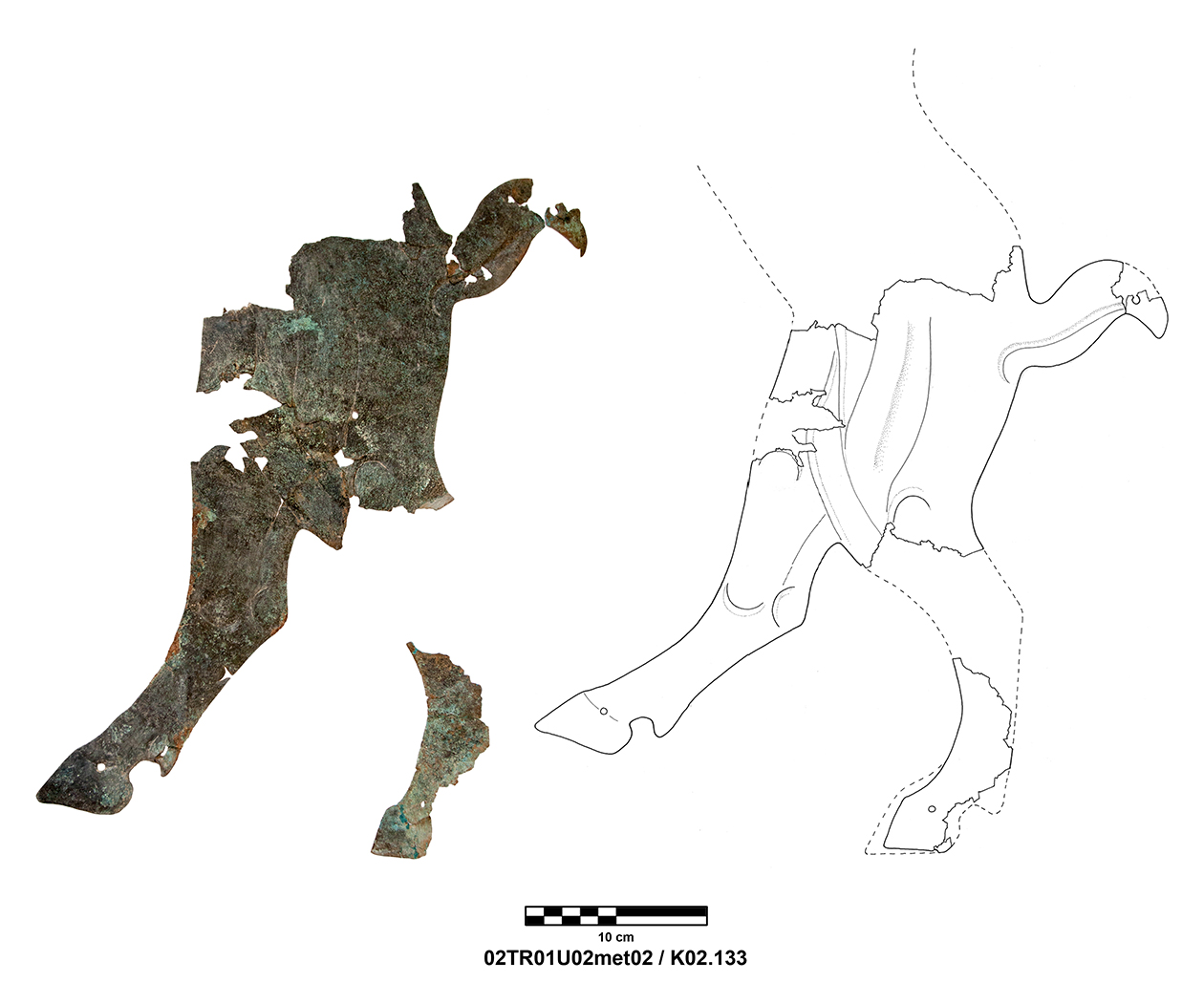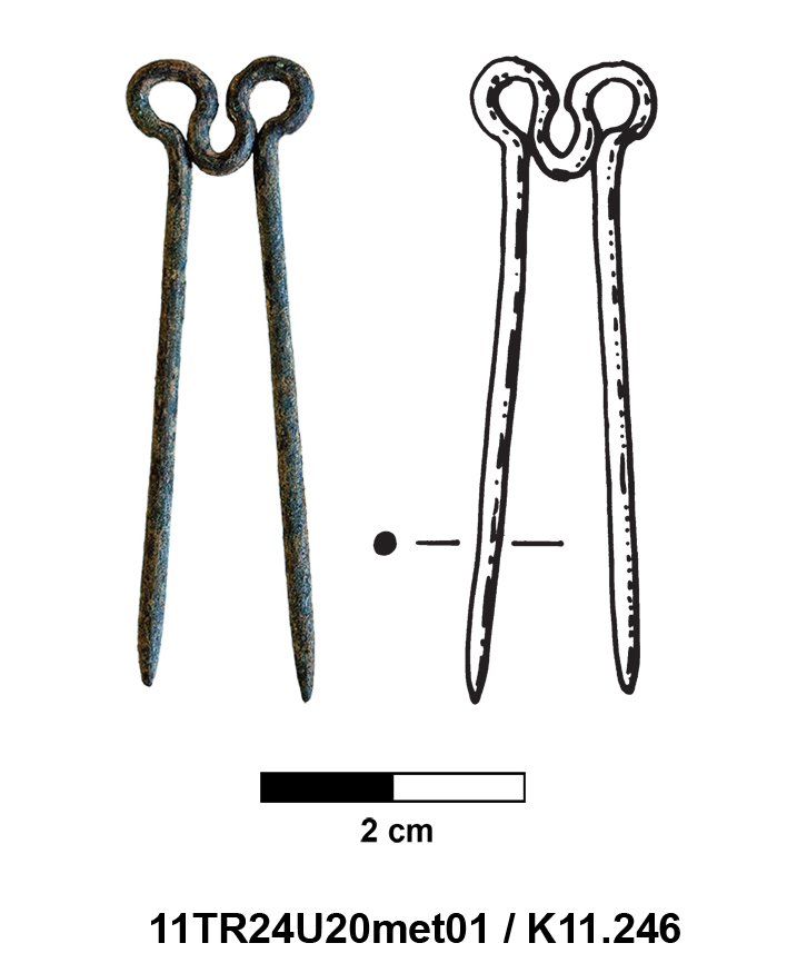 Bowl-shaped copper alloy object with 5 holes and one extant bent nail, complete. Highly polished interior and exterior, hammer marks on interior. Original object recut in antiquity, as attested by the sharp rim profile and uneven top. Object appears to have been slightly deformed in this process. 5 secondary holes, each 1 mm diameter, were drilled from the exterior at irregular intervals. One small nail, approx. 2 cm long, remains, point inward and, apparently, intentionally bent. Original object probably had higher walls. Neither original form nor recut function is clear.