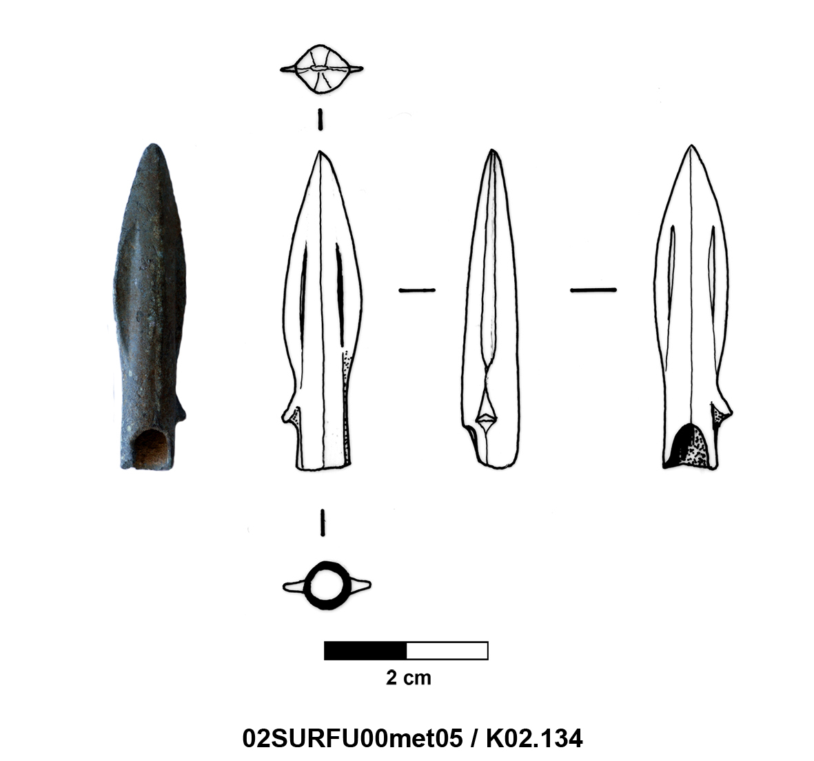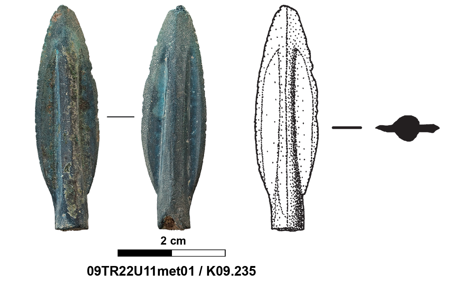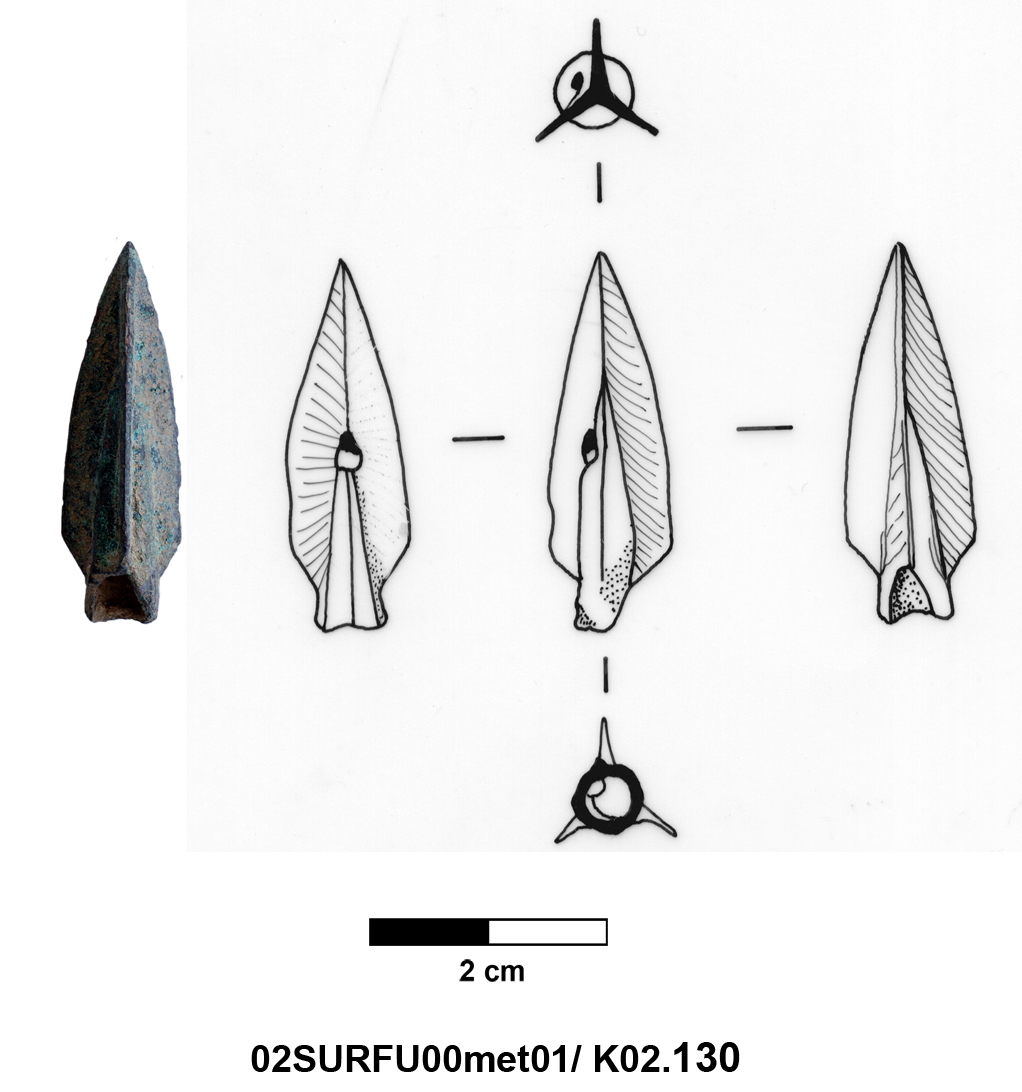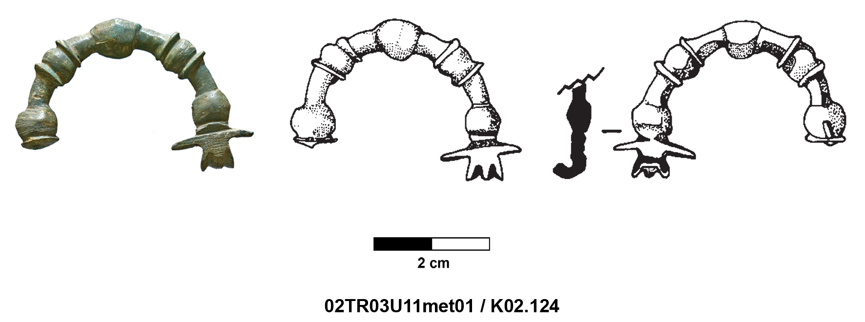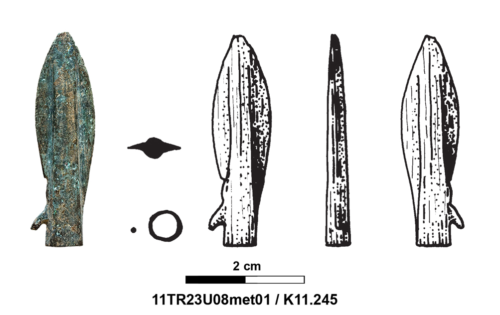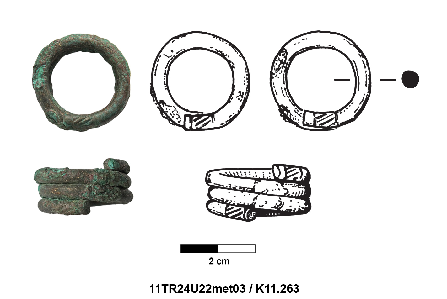 Bowl-shaped copper alloy object with 5 holes and one extant bent nail, complete. Highly polished interior and exterior, hammer marks on interior. Original object recut in antiquity, as attested by the sharp rim profile and uneven top. Object appears to have been slightly deformed in this process. 5 secondary holes, each 1 mm diameter, were drilled from the exterior at irregular intervals. One small nail, approx. 2 cm long, remains, point inward and, apparently, intentionally bent. Original object probably had higher walls. Neither original form nor recut function is clear.
