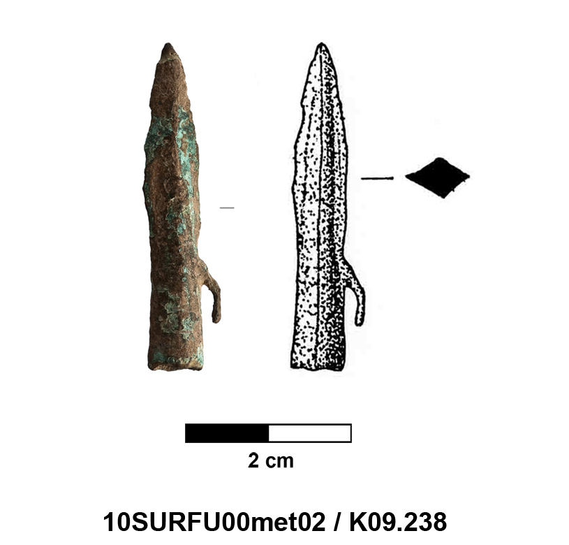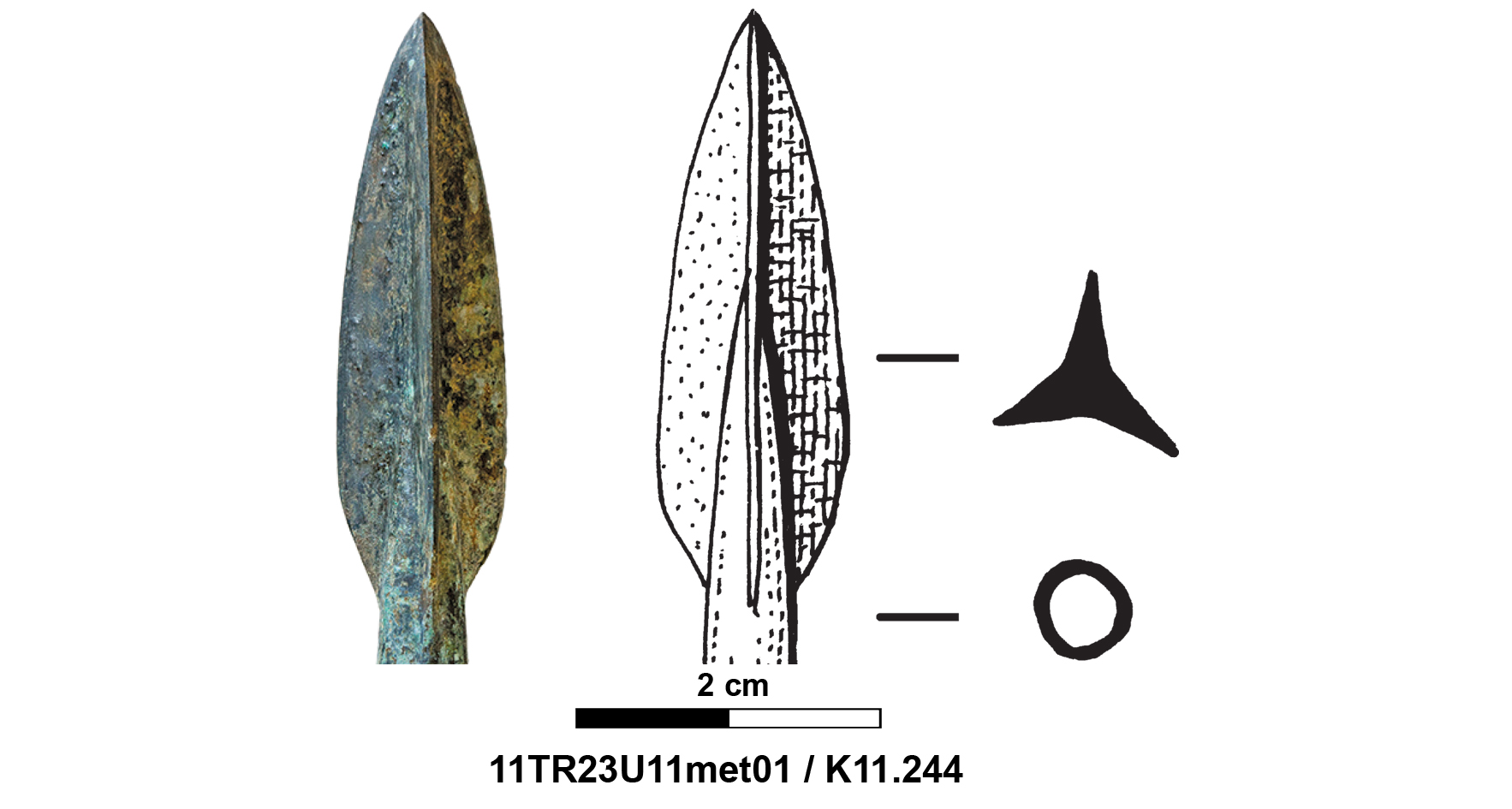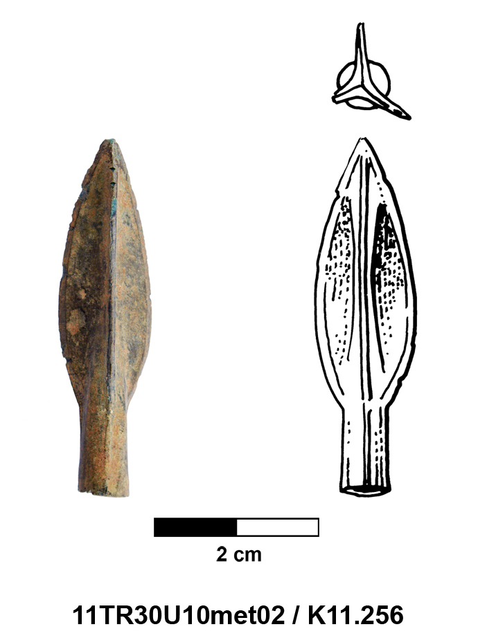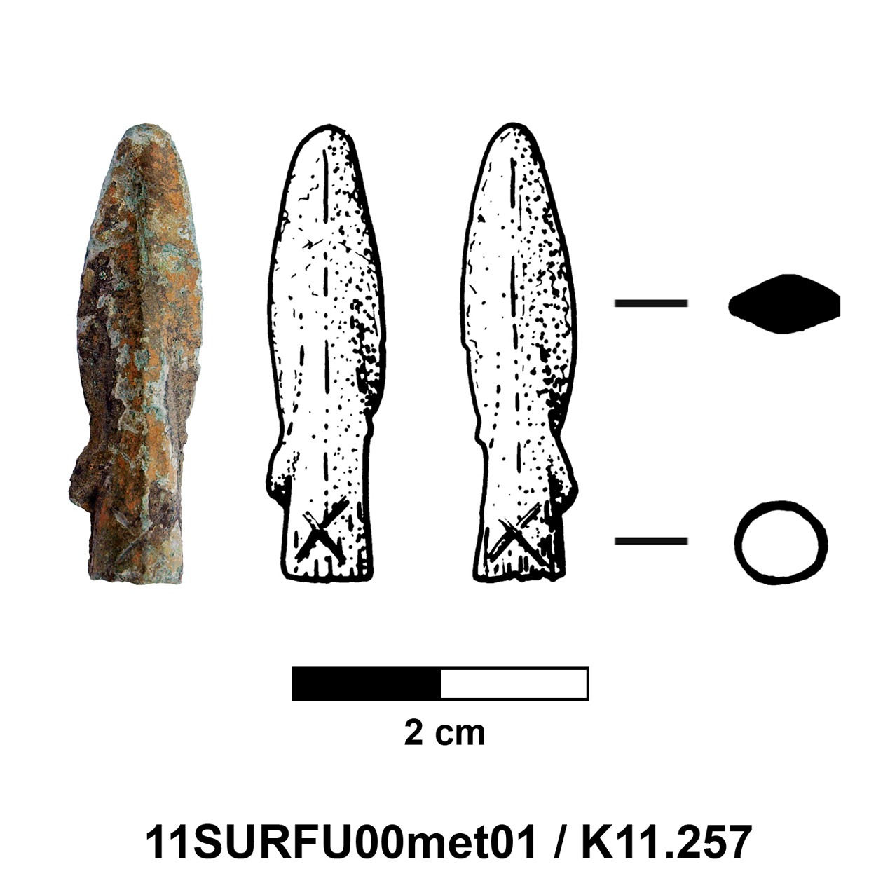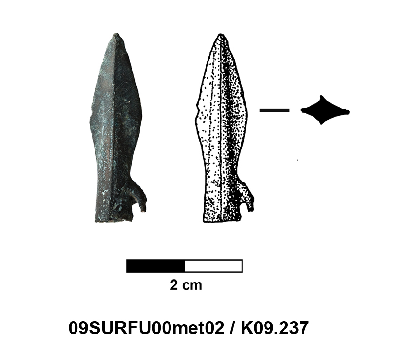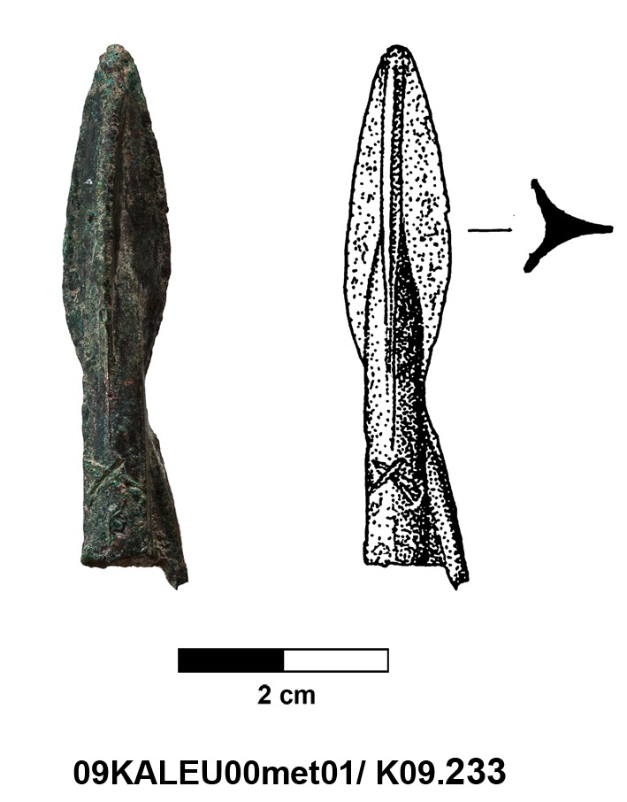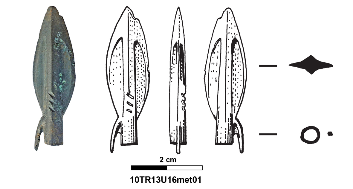 Bowl-shaped copper alloy object with 5 holes and one extant bent nail, complete. Highly polished interior and exterior, hammer marks on interior. Original object recut in antiquity, as attested by the sharp rim profile and uneven top. Object appears to have been slightly deformed in this process. 5 secondary holes, each 1 mm diameter, were drilled from the exterior at irregular intervals. One small nail, approx. 2 cm long, remains, point inward and, apparently, intentionally bent. Original object probably had higher walls. Neither original form nor recut function is clear.