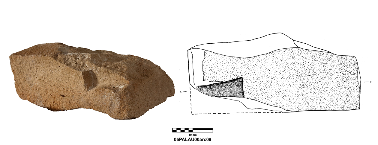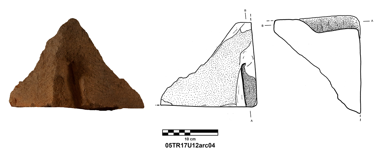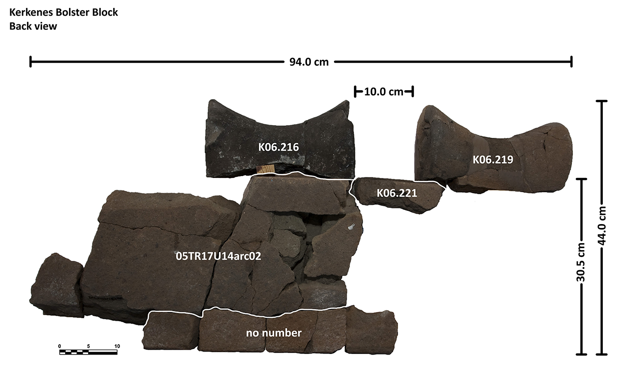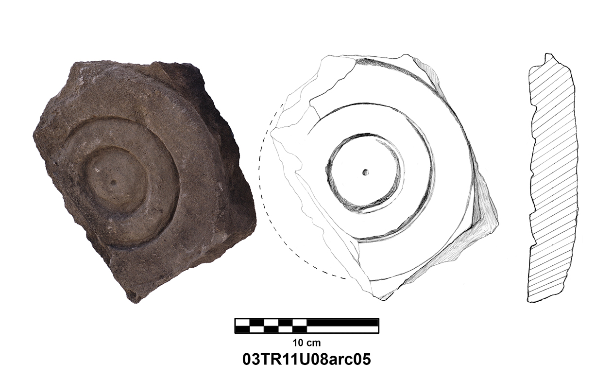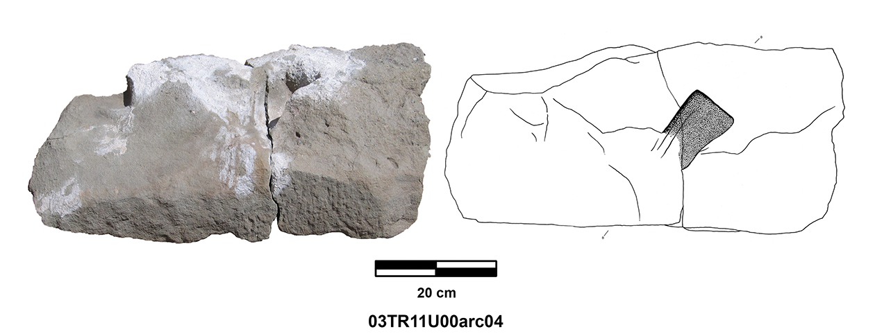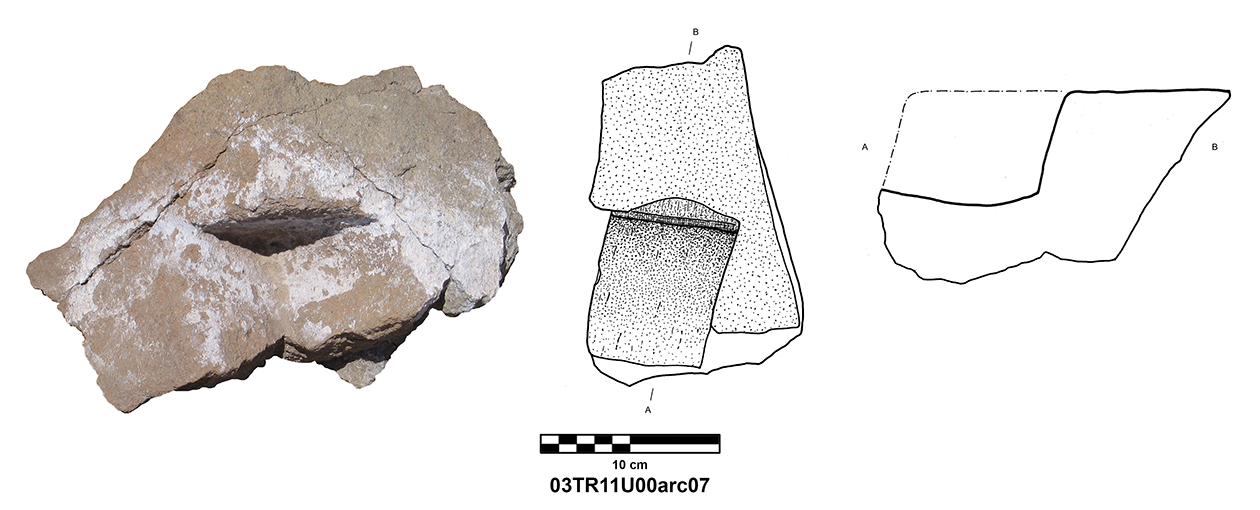 Length of fully preserved side: 48.5 cm. Width 46 – 48 cm. Height/thickness of slab: 10 cm. Diameter of bolster faces: circa 7 cm. Length of bolsters: 13 cm. Top cutting length: 22.5 cm. Width 9.8 cm. Depth: 3.2 cm. Bottom cutting length: 7 cm. Width: 7 cm. Depth: 5.8 cm at the center.