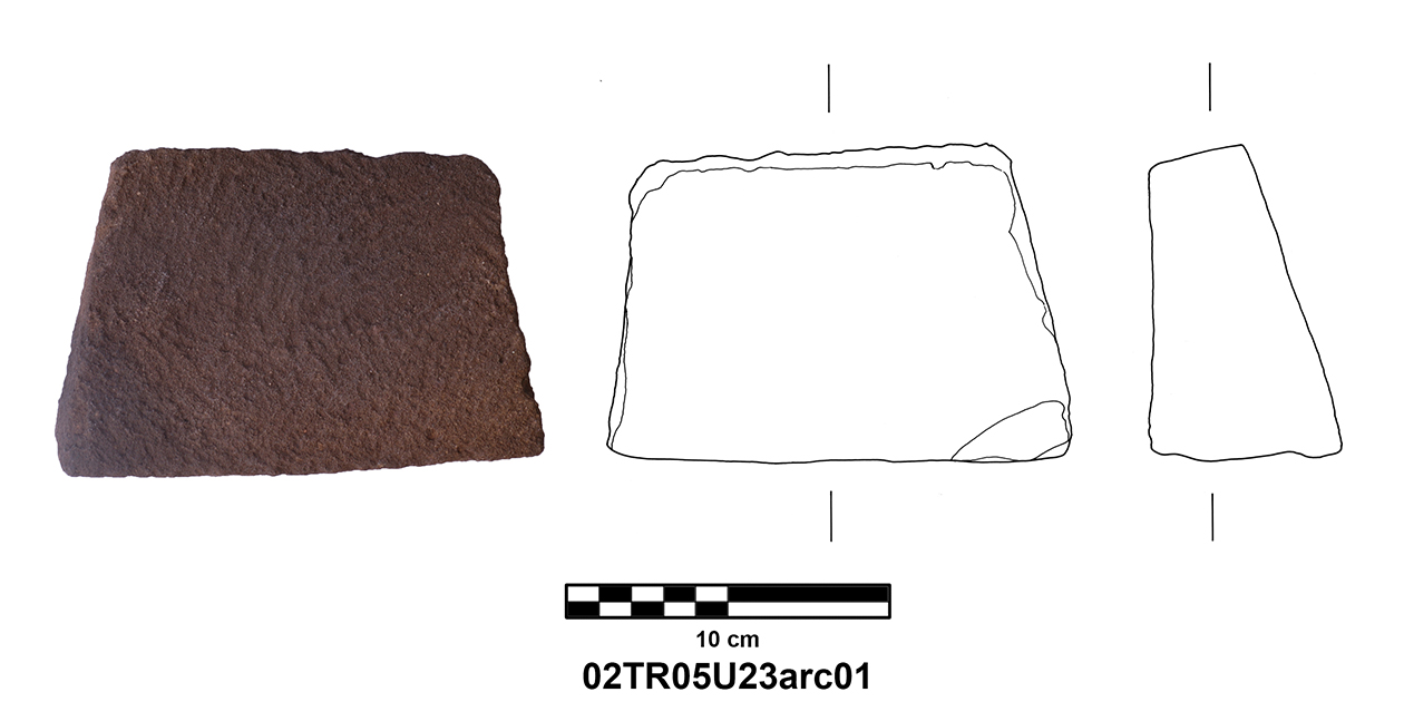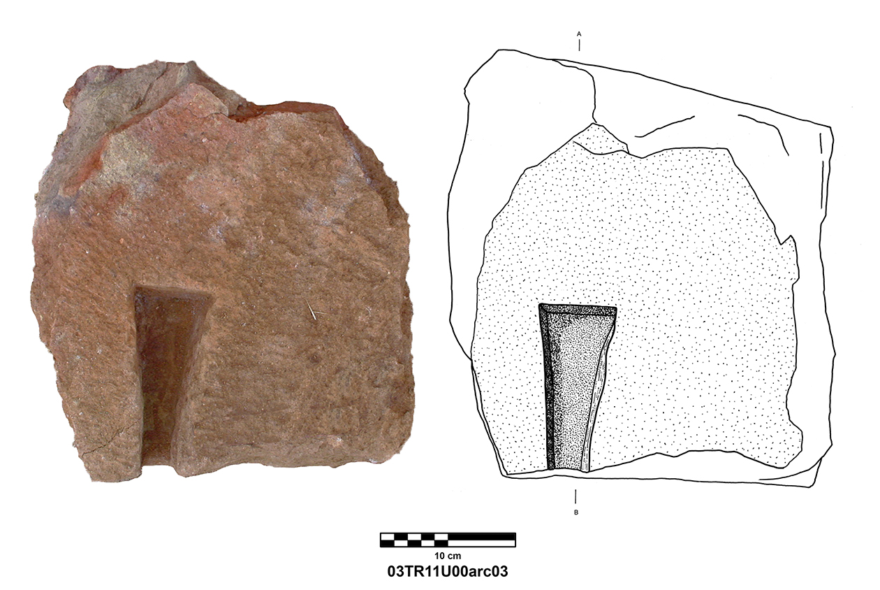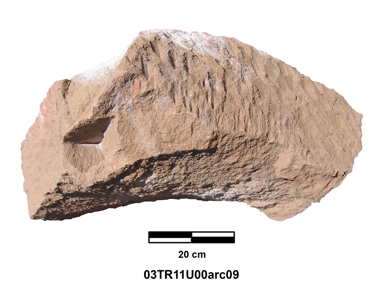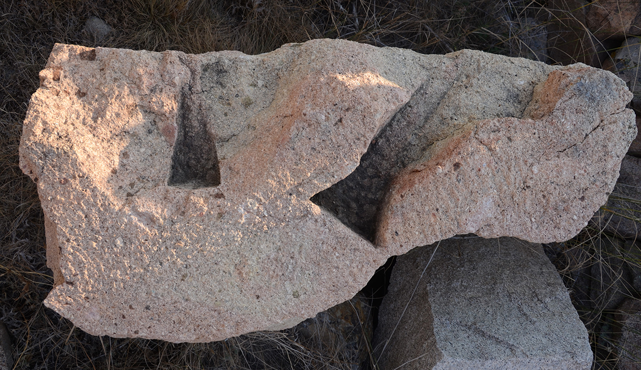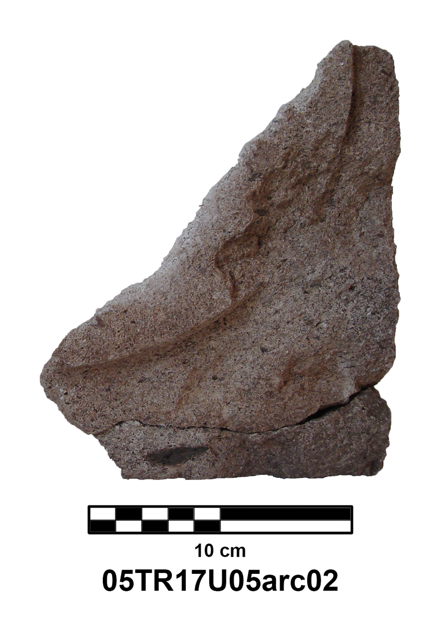 Length of fully preserved side: 48.5 cm. Width 46 – 48 cm. Height/thickness of slab: 10 cm. Diameter of bolster faces: circa 7 cm. Length of bolsters: 13 cm. Top cutting length: 22.5 cm. Width 9.8 cm. Depth: 3.2 cm. Bottom cutting length: 7 cm. Width: 7 cm. Depth: 5.8 cm at the center.