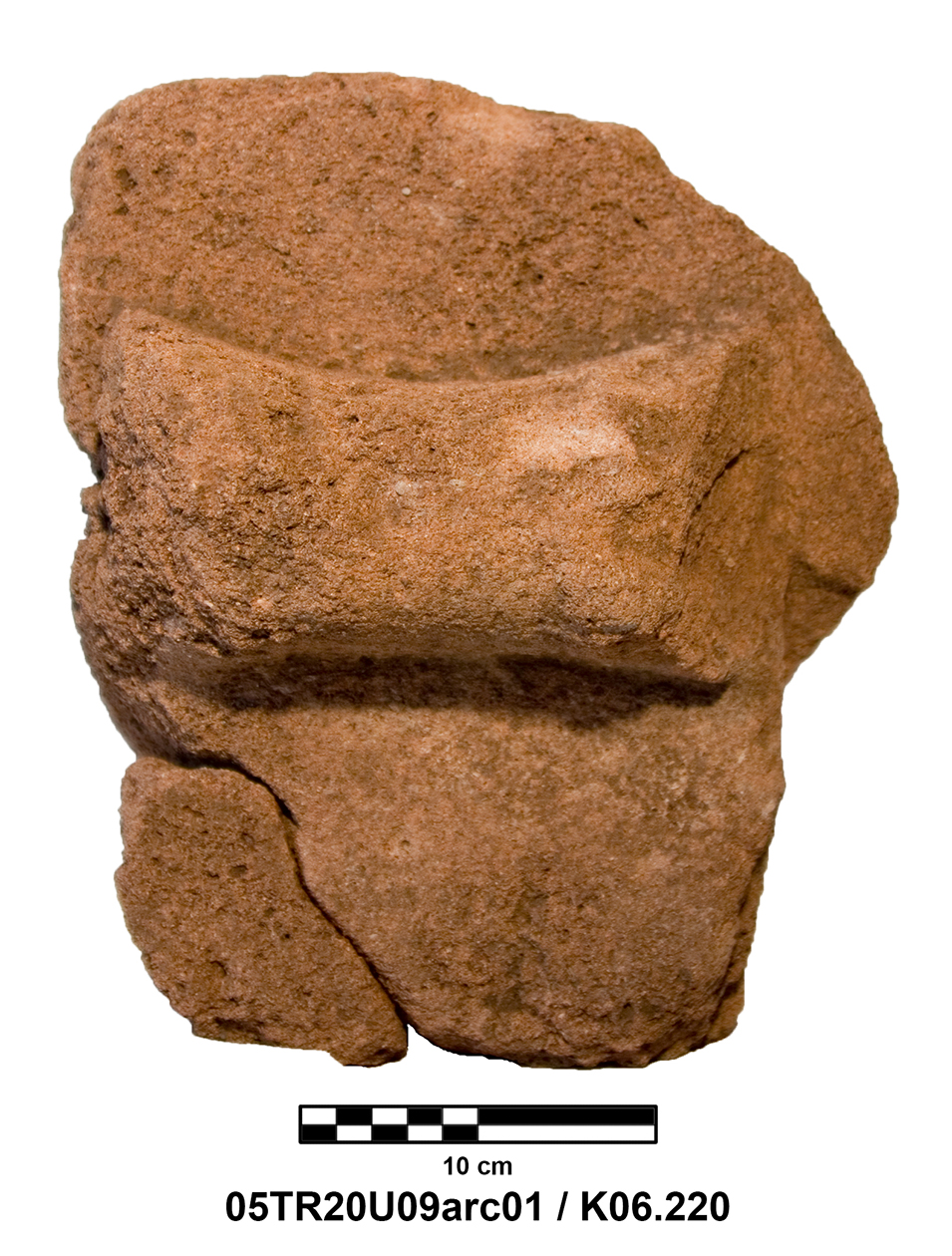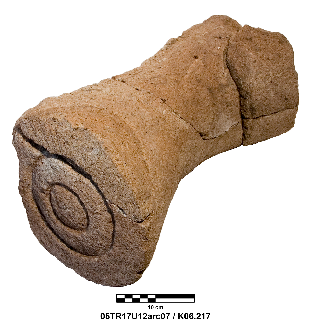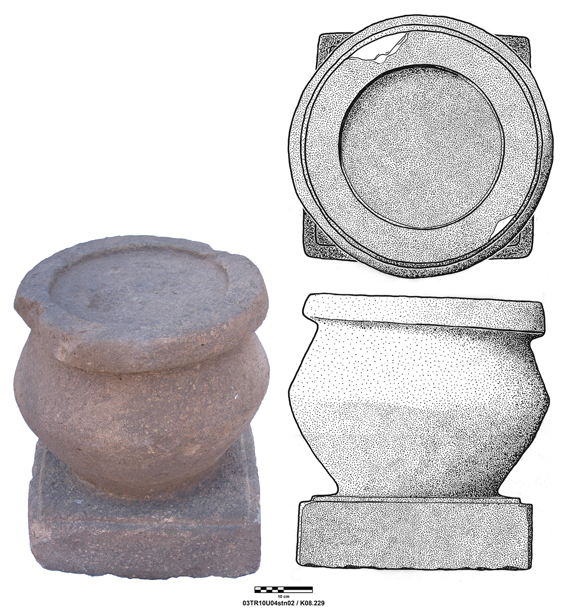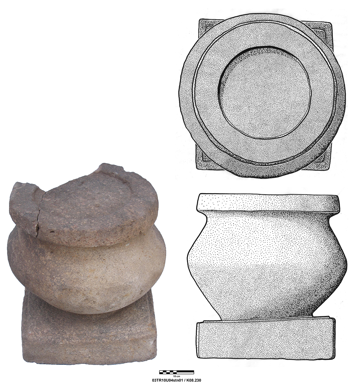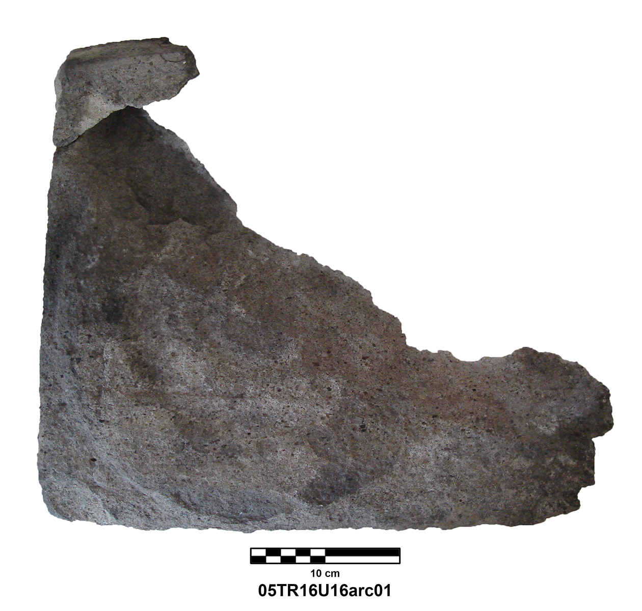 Length of fully preserved side: 48.5 cm. Width 46 – 48 cm. Height/thickness of slab: 10 cm. Diameter of bolster faces: circa 7 cm. Length of bolsters: 13 cm. Top cutting length: 22.5 cm. Width 9.8 cm. Depth: 3.2 cm. Bottom cutting length: 7 cm. Width: 7 cm. Depth: 5.8 cm at the center.