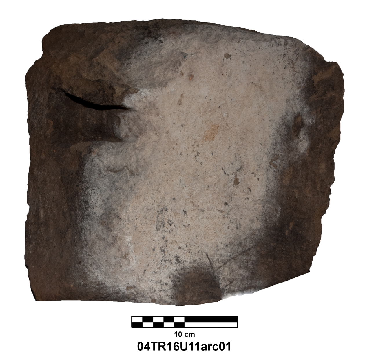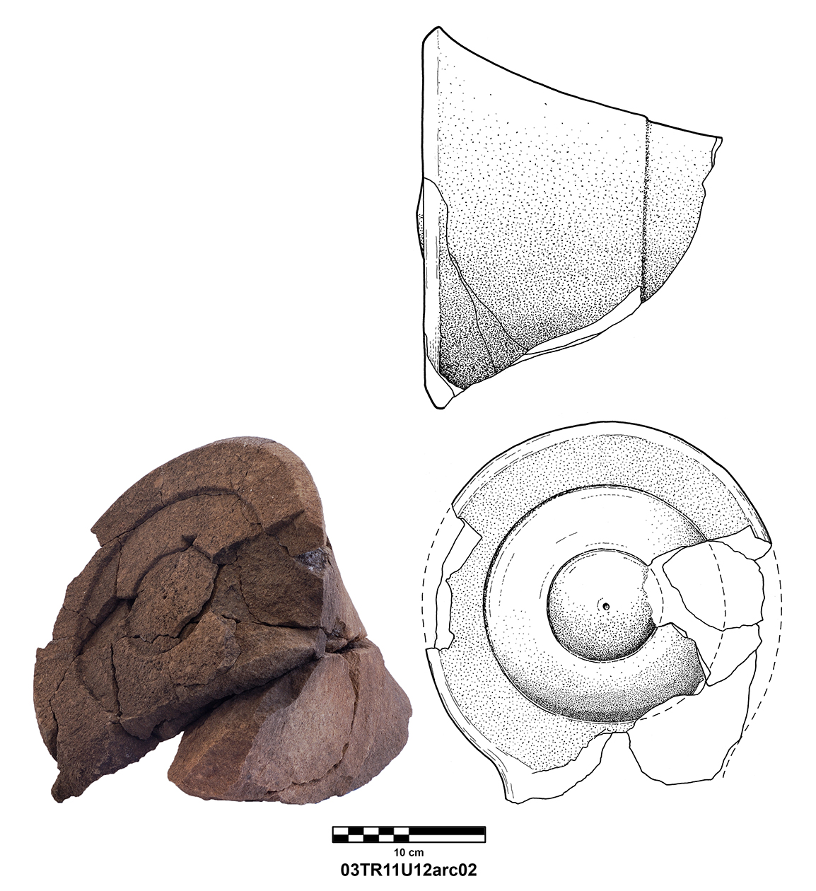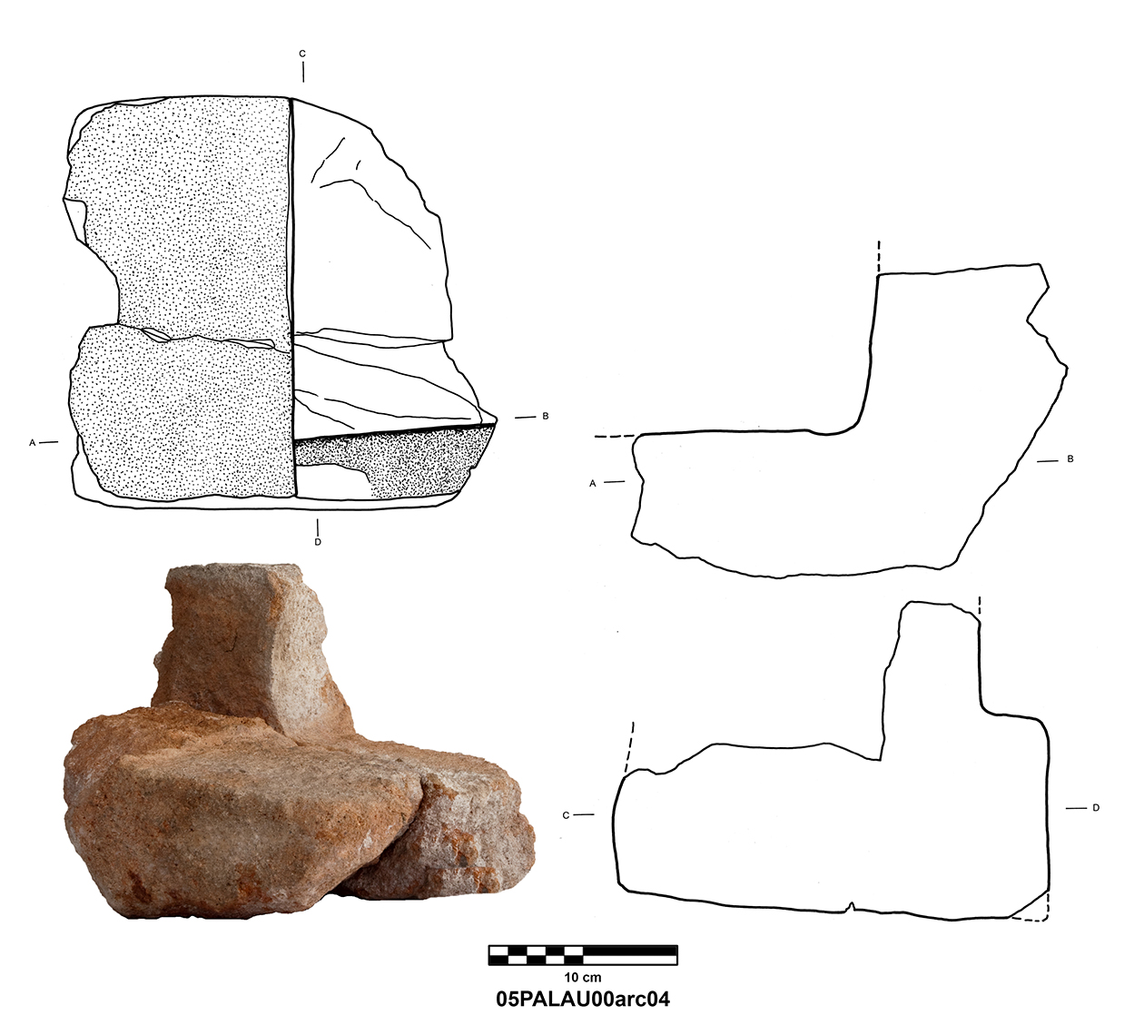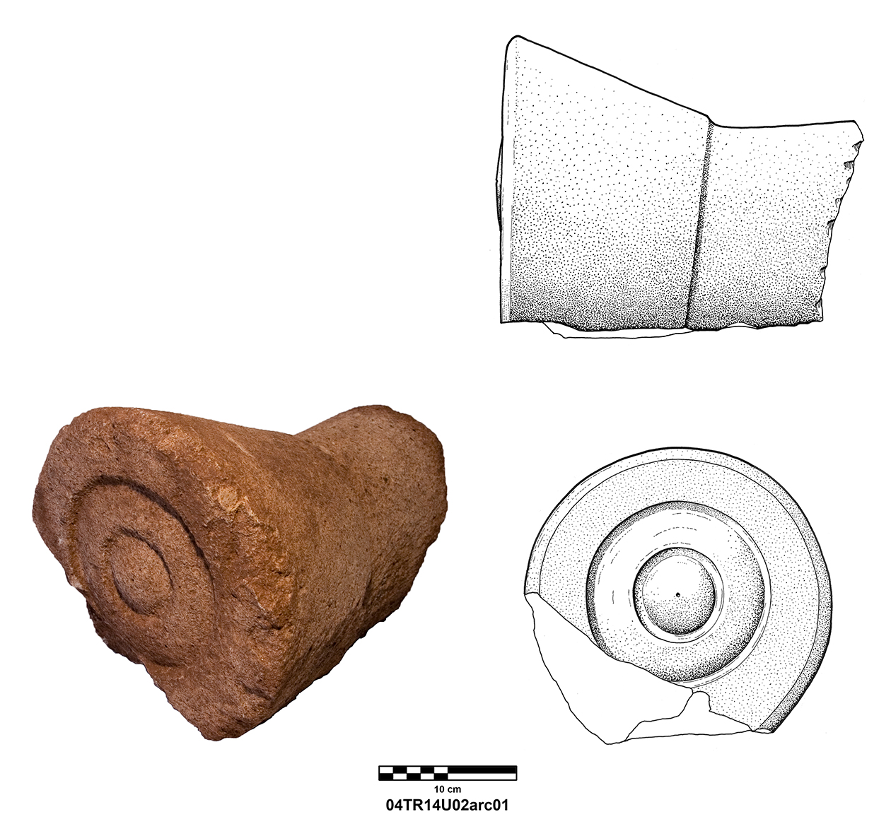 Length of fully preserved side: 48.5 cm. Width 46 – 48 cm. Height/thickness of slab: 10 cm. Diameter of bolster faces: circa 7 cm. Length of bolsters: 13 cm. Top cutting length: 22.5 cm. Width 9.8 cm. Depth: 3.2 cm. Bottom cutting length: 7 cm. Width: 7 cm. Depth: 5.8 cm at the center.