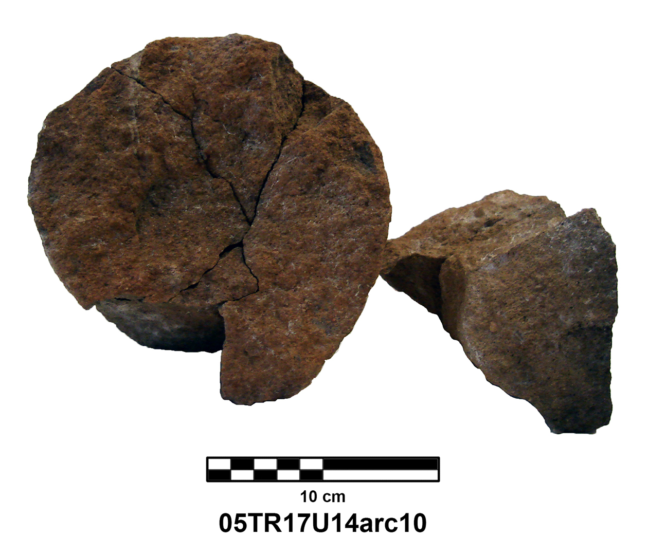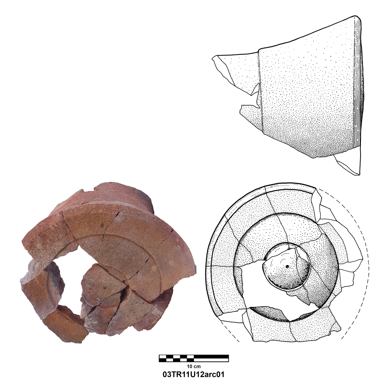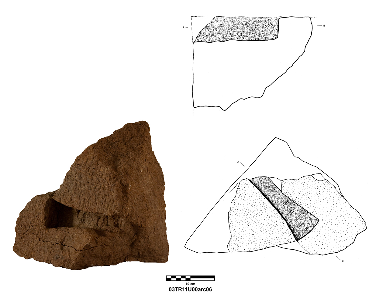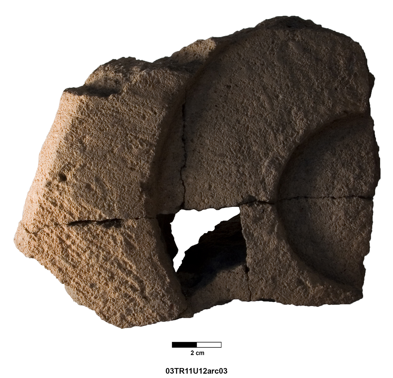 Length of fully preserved side: 48.5 cm. Width 46 – 48 cm. Height/thickness of slab: 10 cm. Diameter of bolster faces: circa 7 cm. Length of bolsters: 13 cm. Top cutting length: 22.5 cm. Width 9.8 cm. Depth: 3.2 cm. Bottom cutting length: 7 cm. Width: 7 cm. Depth: 5.8 cm at the center.
