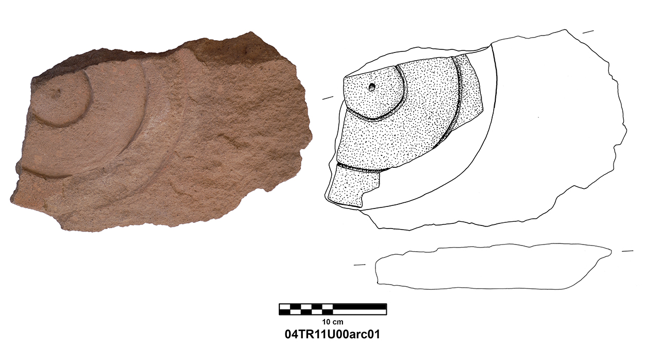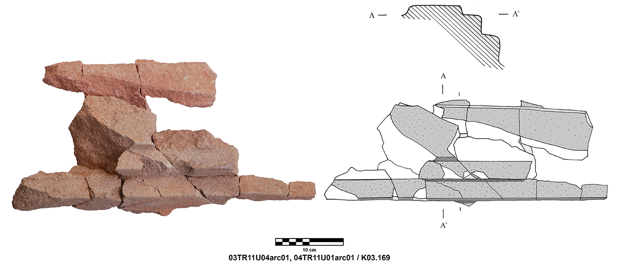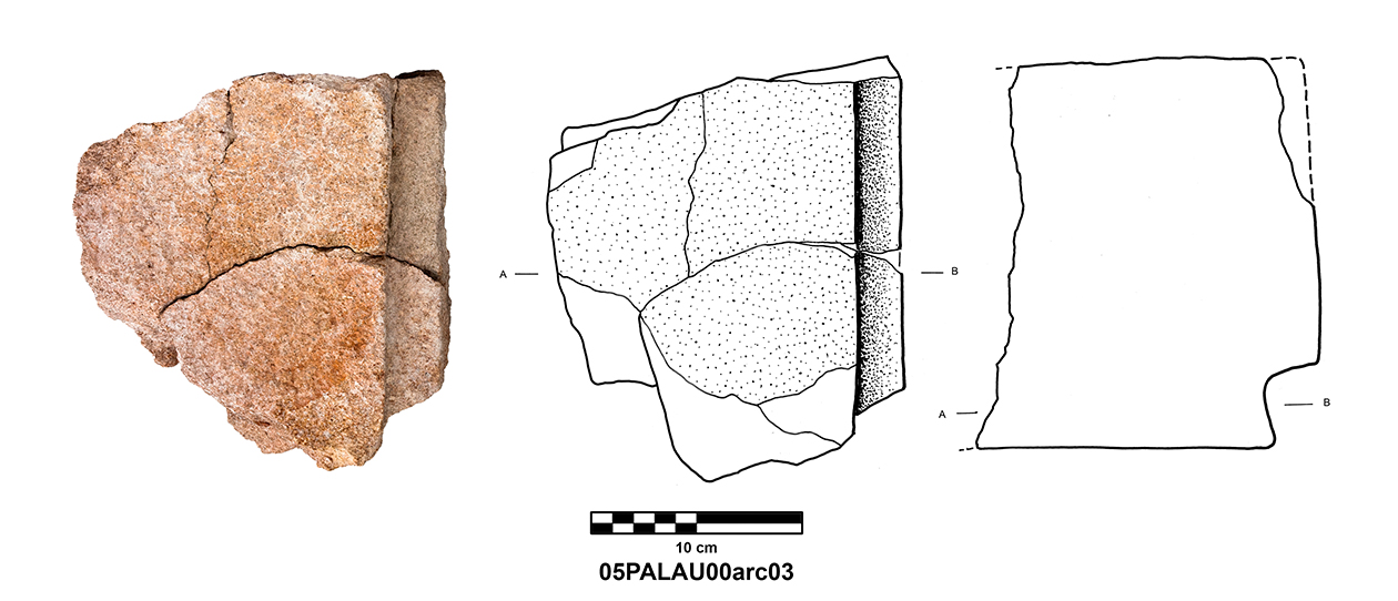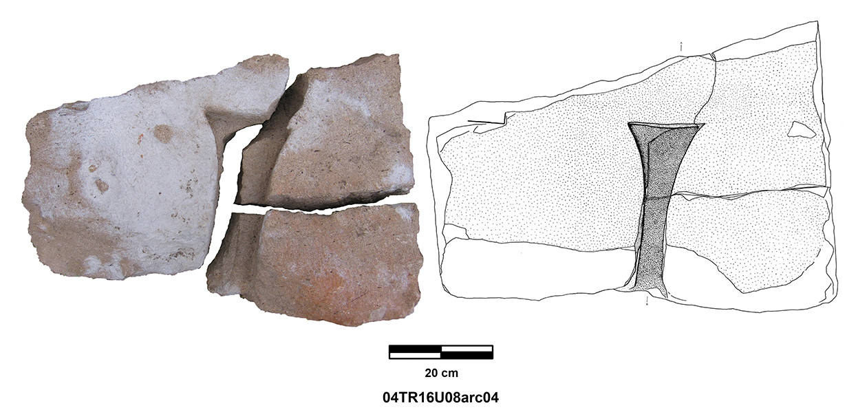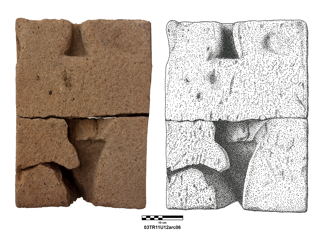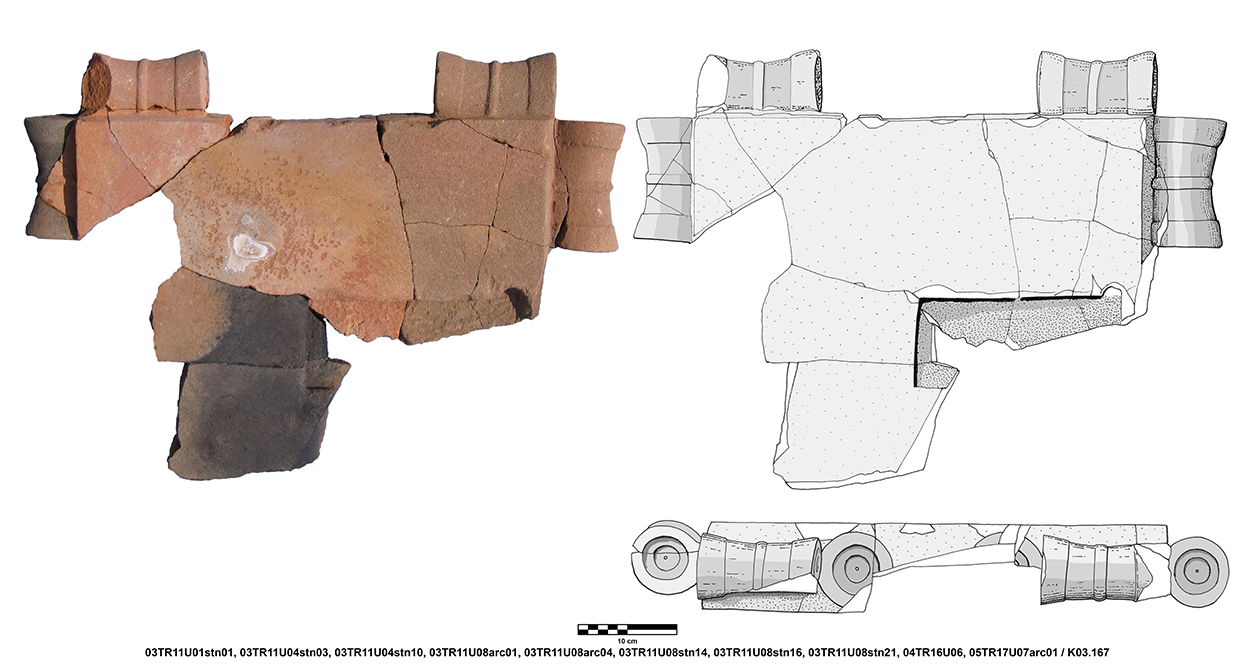 Palatial Complex, Monumental Entrance. Most pieces were recovered from Trench 11, with additional fragments being found in Trenches 16 and 17. Many of the fragments were in later robber pits, while some were found in the destruction layer above the pavement.