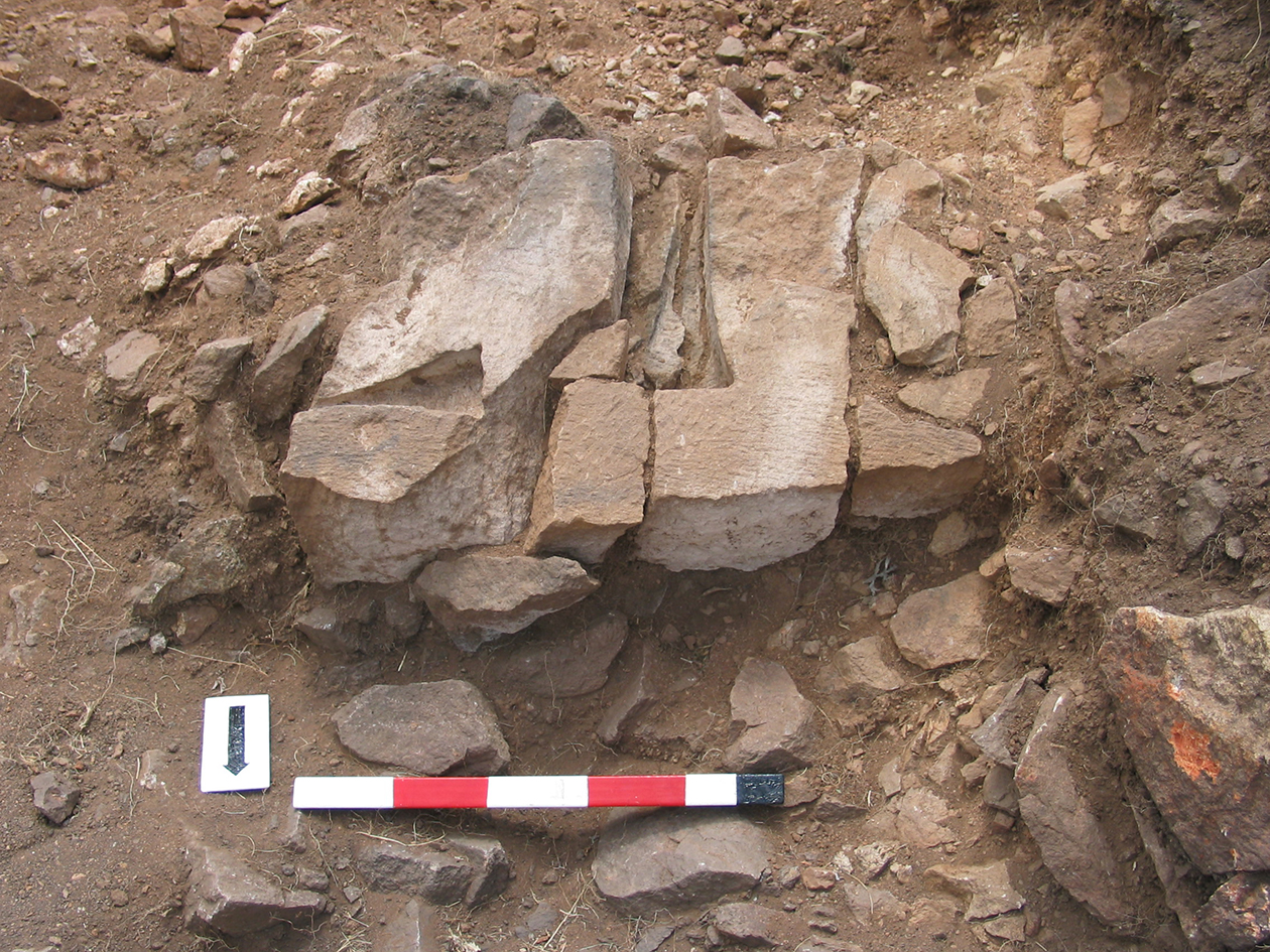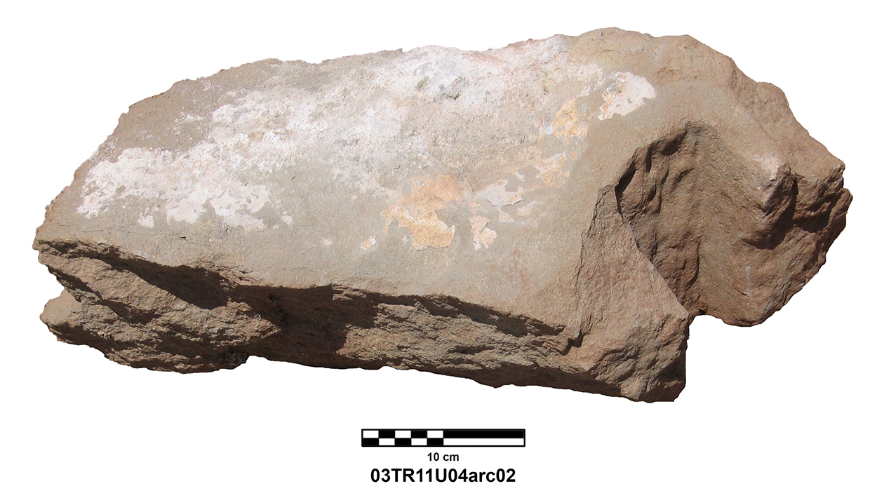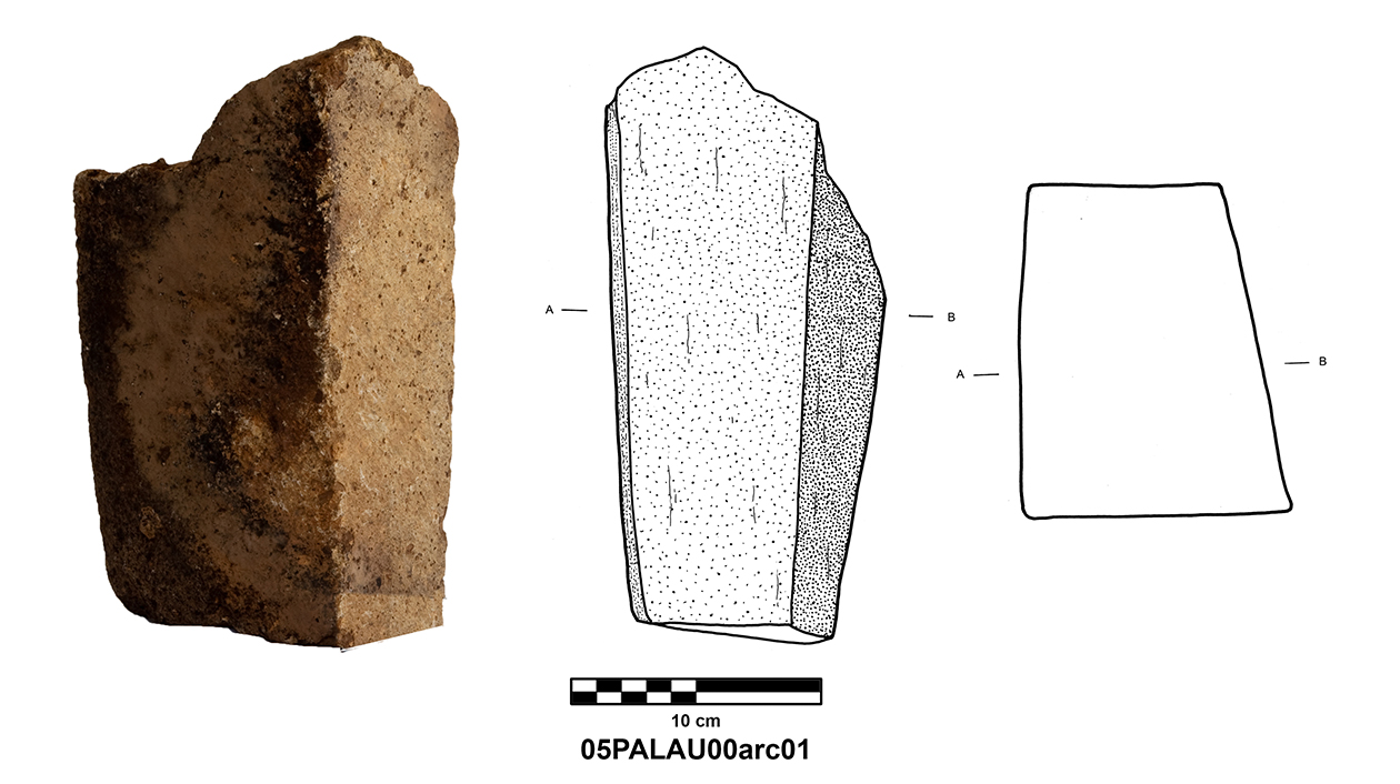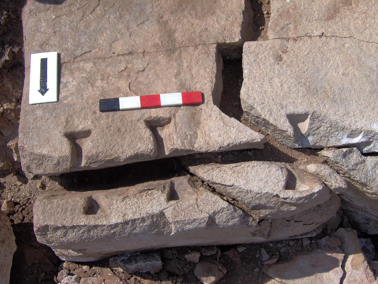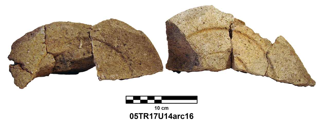 Palatial Complex, Monumental Entrance. Most pieces were recovered from Trench 11, with additional fragments being found in Trenches 16 and 17. Many of the fragments were in later robber pits, while some were found in the destruction layer above the pavement.