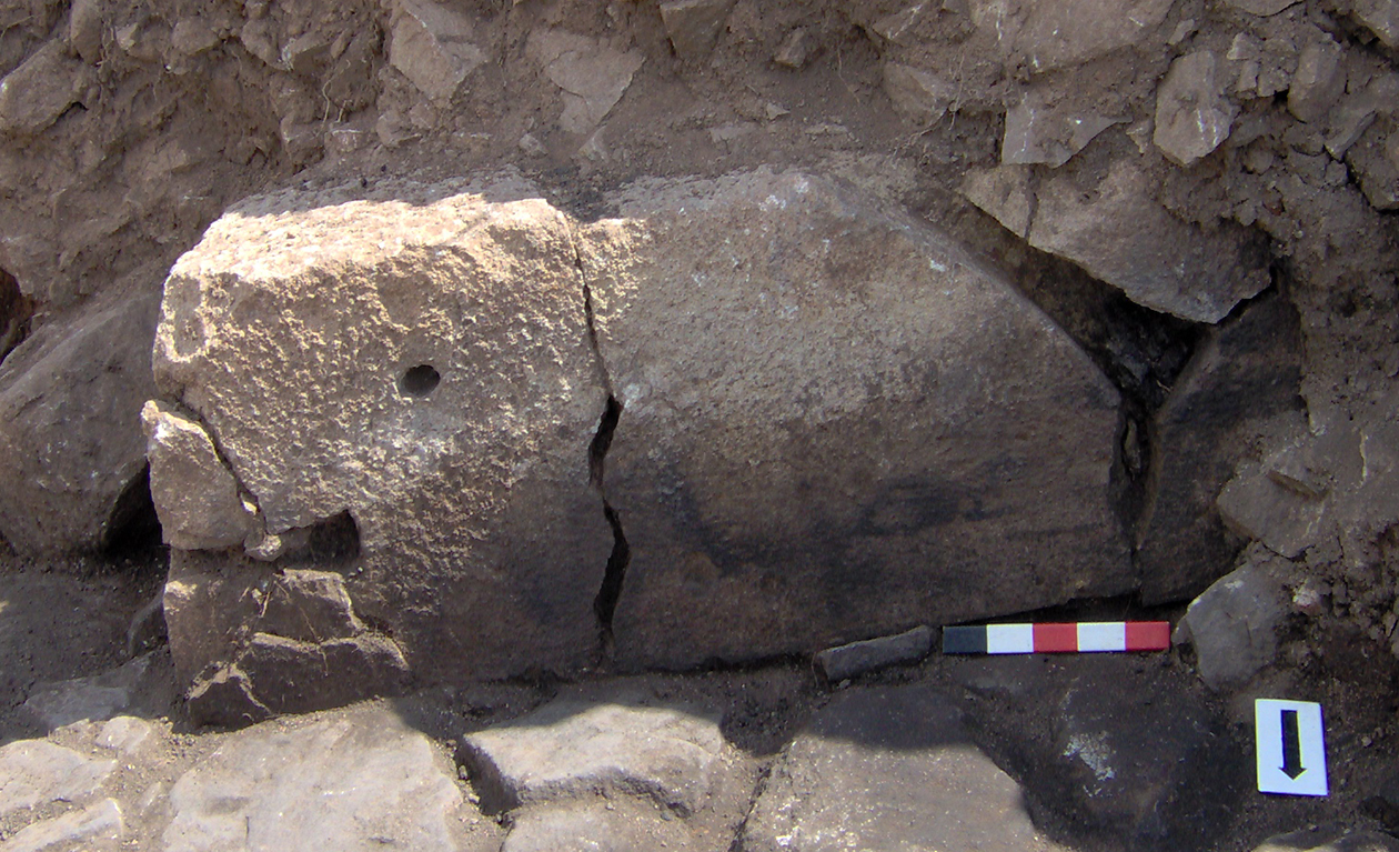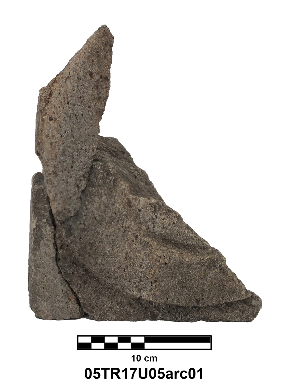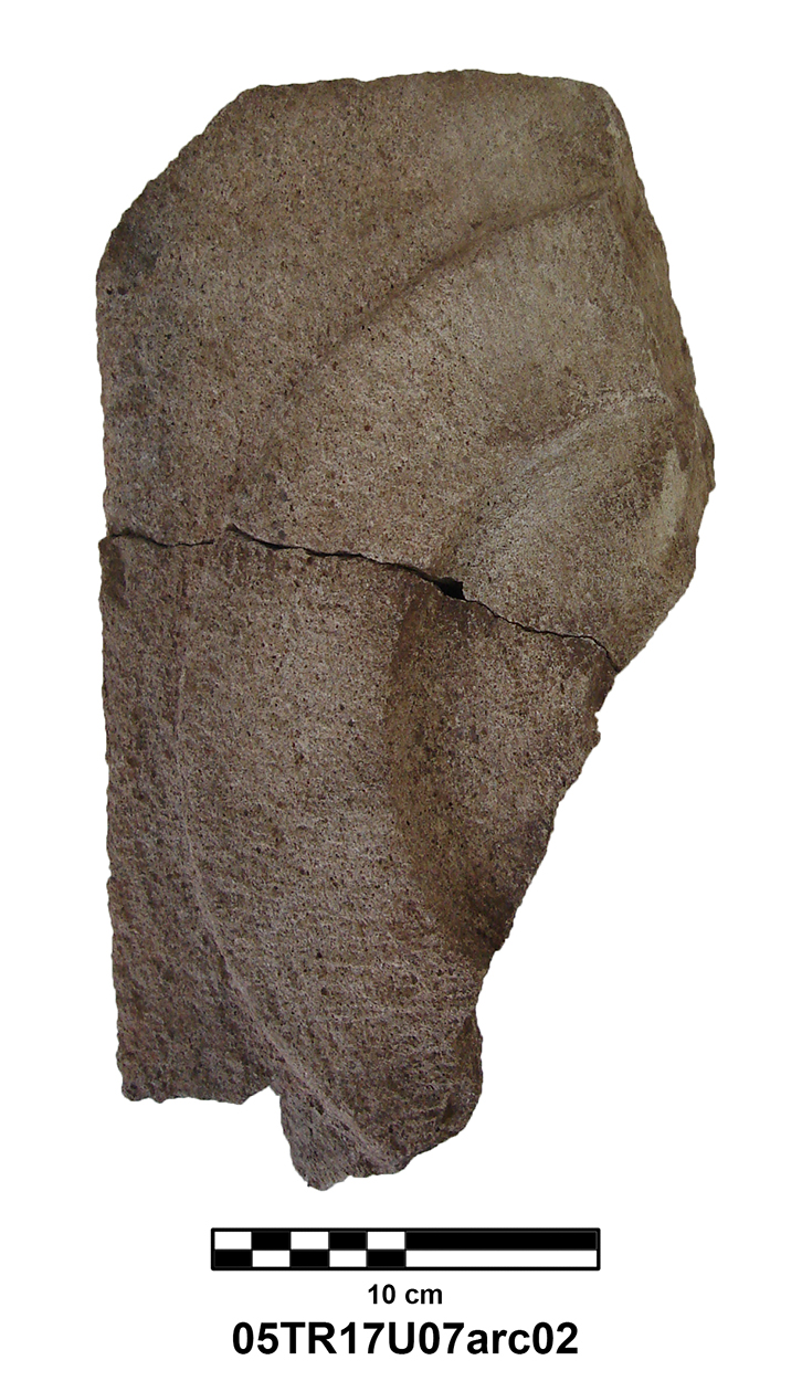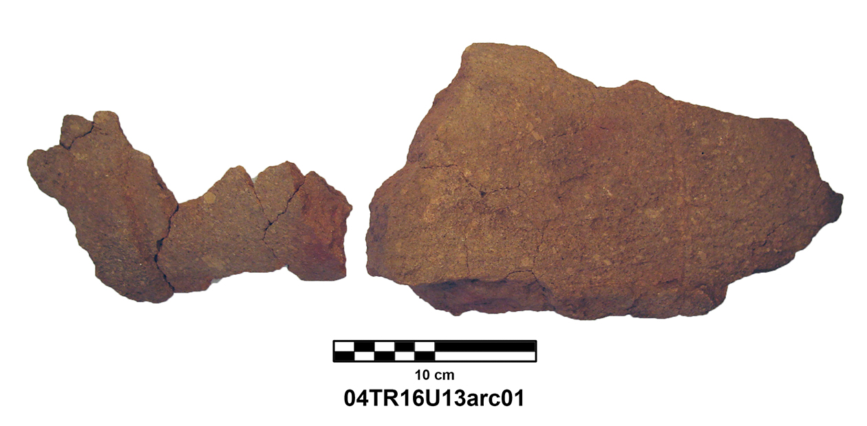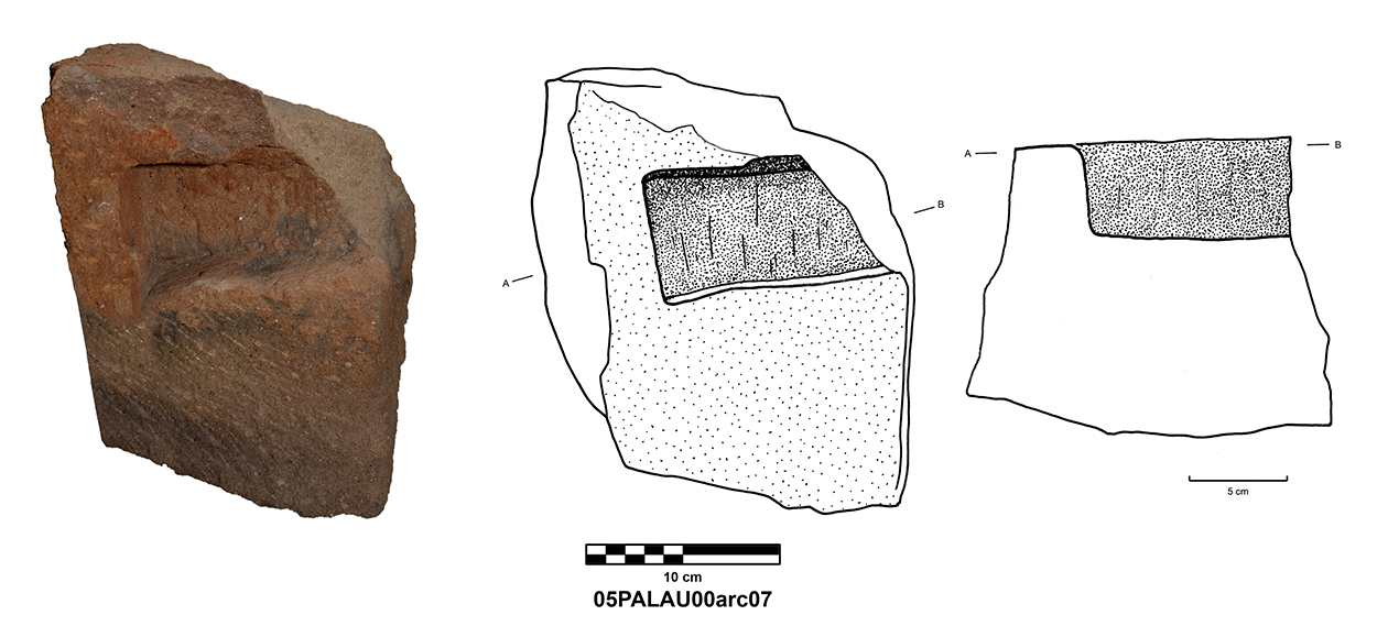 Palatial Complex, Monumental Entrance. Most pieces were recovered from Trench 11, with additional fragments being found in Trenches 16 and 17. Many of the fragments were in later robber pits, while some were found in the destruction layer above the pavement.