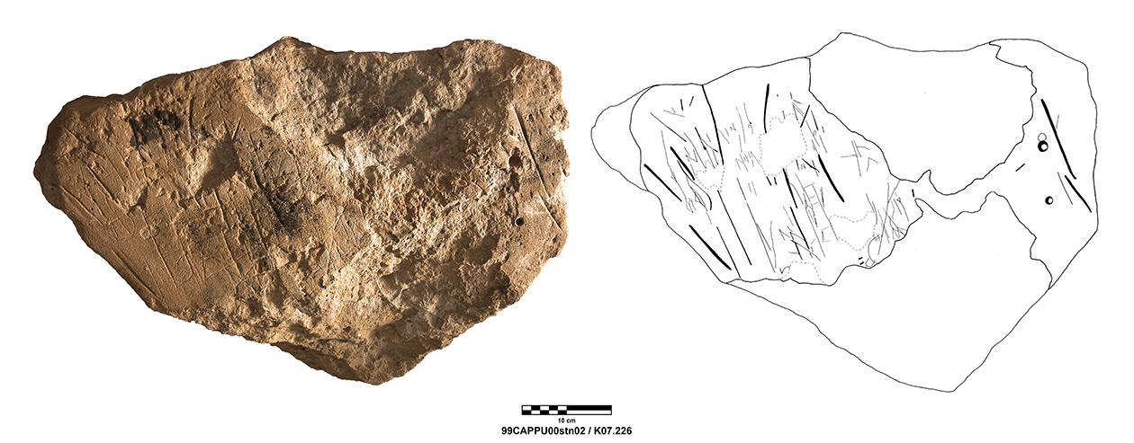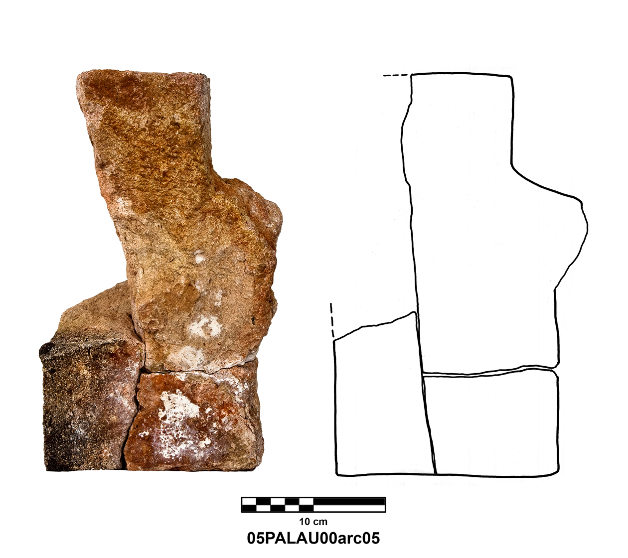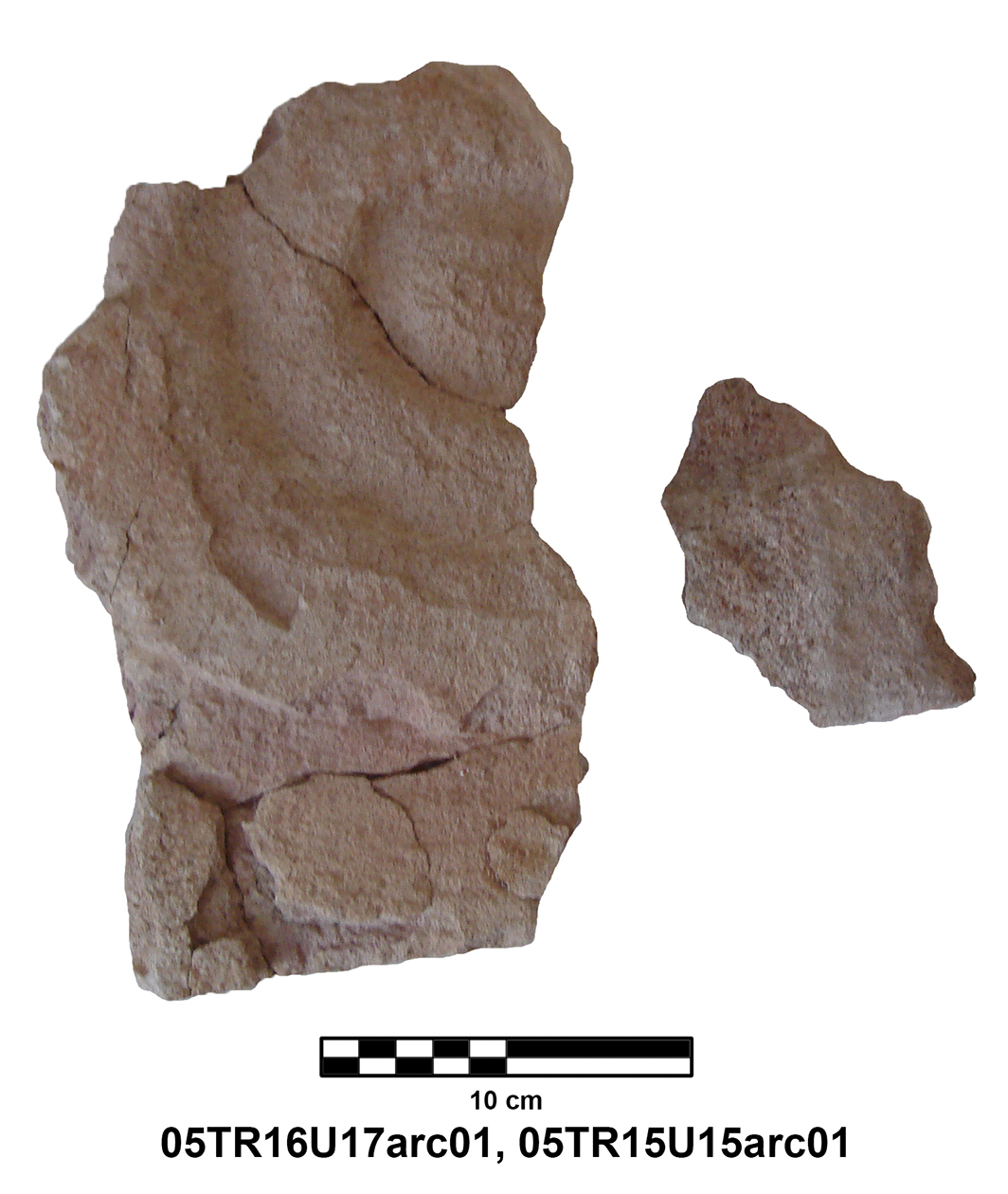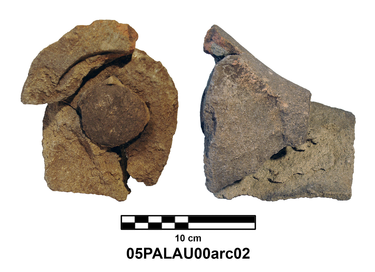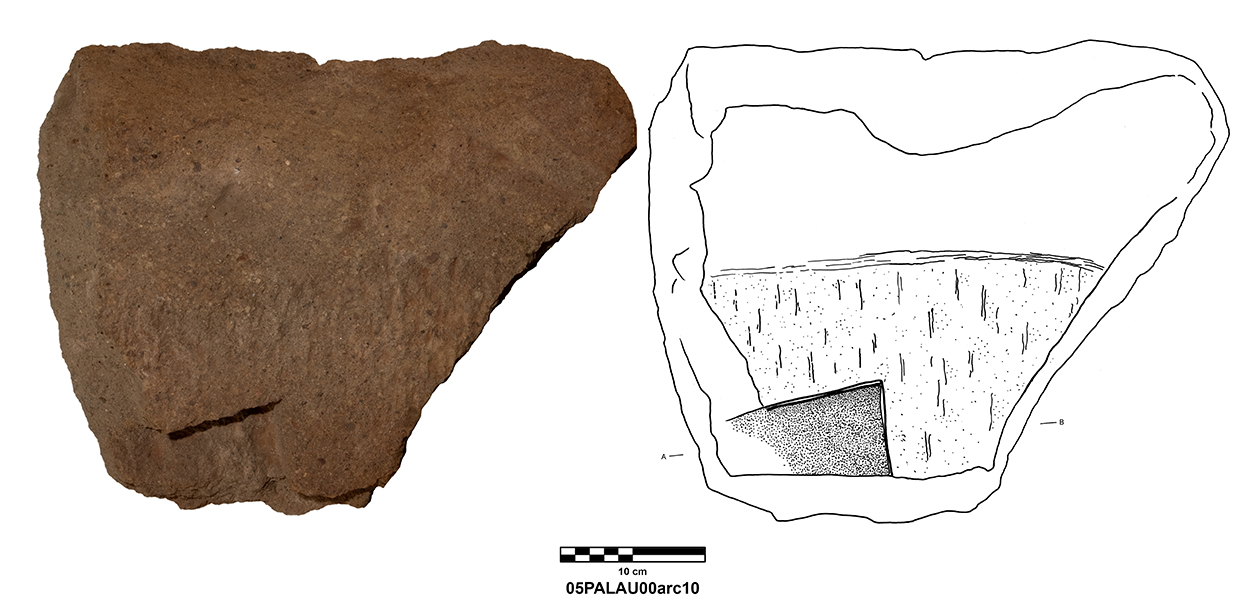 Palatial Complex, Monumental Entrance. Most pieces were recovered from Trench 11, with additional fragments being found in Trenches 16 and 17. Many of the fragments were in later robber pits, while some were found in the destruction layer above the pavement.