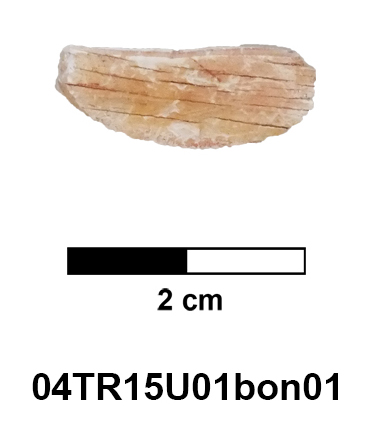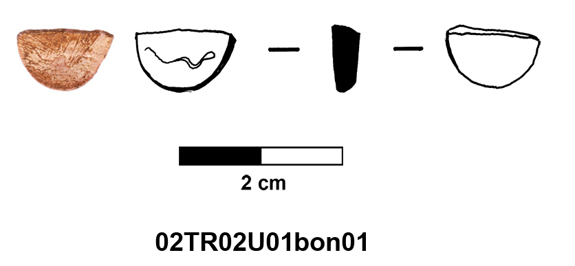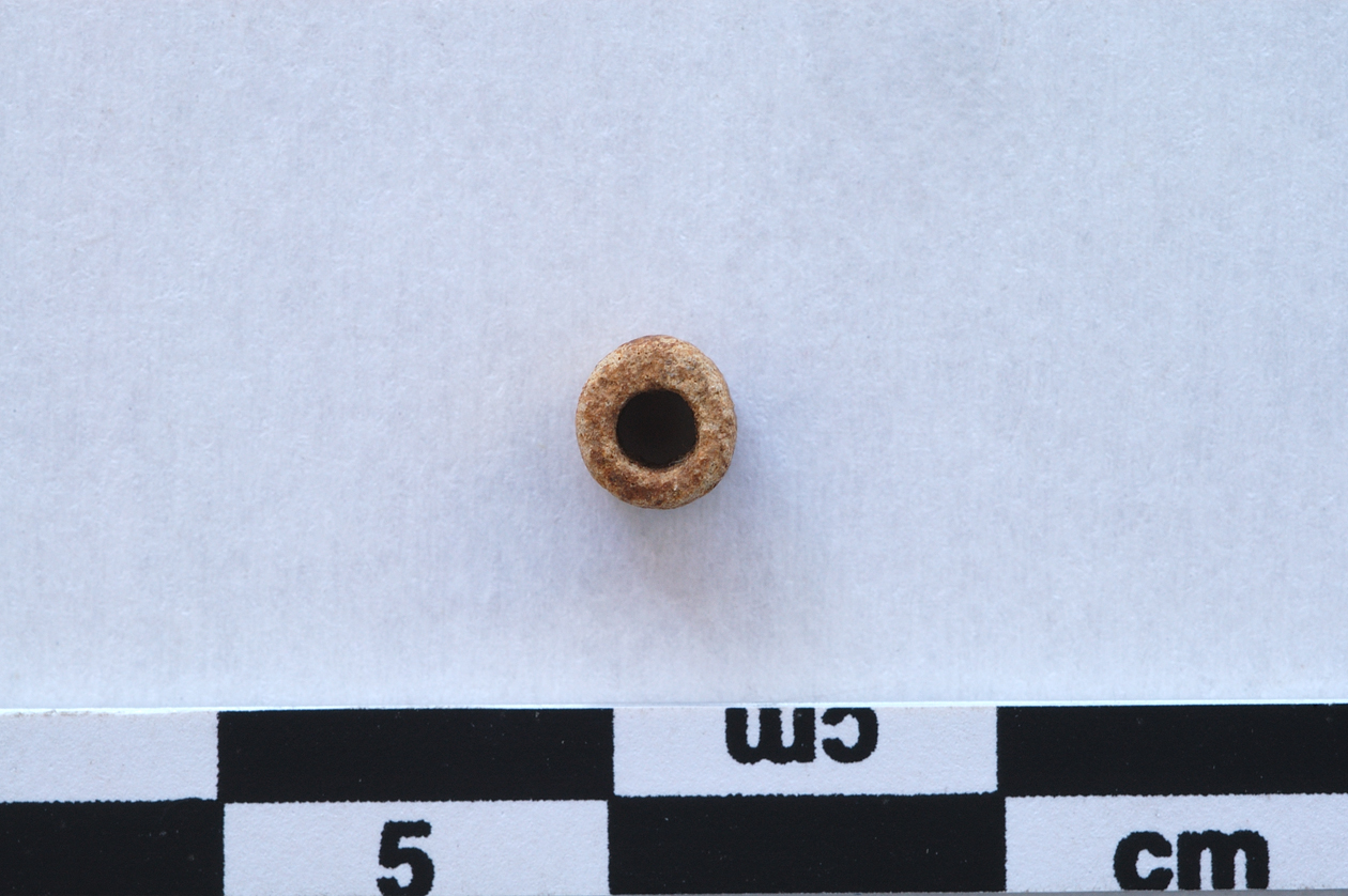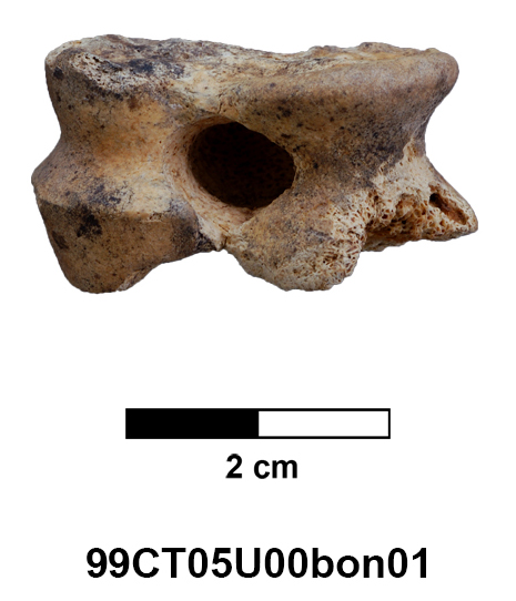 Astragalus, or knucklebone, from Ovis aries or Capra hircus (sheep or goat); left side with perforation bored through it. Heavily burned on one side.