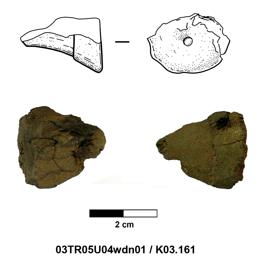 Furniture fragment. Blackened by fire. Bolster-shaped terminal.
