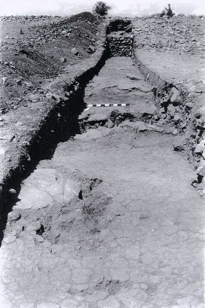 - TT15, Araştırma Alanı (B), ölçülmüş boyutlar 2 x 72 m. Jeomanyetik haritayı test etmek ve işlevleri belirlemek üzere tasarlanmış olup, dikme kaidelerine rastlama şansını azami düzeye yükseltmek için yapı grubuna açılı biçimde yerleştirilmiştir. Dikmeli salon iki ölçü çubuğu arasında ve zemini taş kaplanmış geçit ile Şekil 4'te görülen oda arka kısımda görülen nispeten daha yüksek bir düzlemde bulunmaktadır. Salon ve fotoğrafın ön kısmında görülen odanın sıkıştırılmış toprak zeminleri güçlü bir yangına maruz kalmış olup, taş dikme kaideleri fotoğrafın ön sol ve orta kısmında yan dönmüş biçimde görülmektedir. | |||