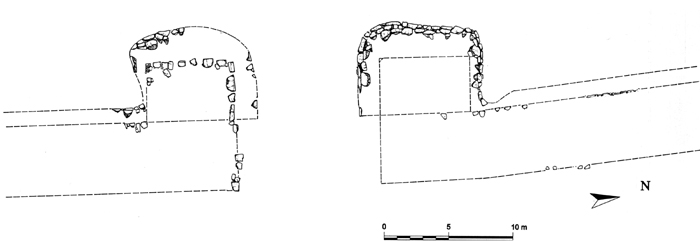 - Plan of the West Gate showing the stone glacis around three sides of the tower, unlike the new gate on Fig. 10. - Batı Kapısı'ndaki kulenin üç tarafını çevreleyen rampayı (glacis) gösteren plan.