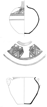 Kırmızı mal, çok renkli testi. Bezemenin olmadığı bölümde emzik ağız kesmesi, üst yarıda beyaz boya üzerine kırmızı tarama ve siyah bezeme, çok cilalanmış. Ölçek 1:4 - b. Typical 2 handled grey ware cooking pot with everted rim and flat base. Hand-made, wheel finished, burnished. Scale 1:4. Tipik iki kulplu gri pişirme kabı.