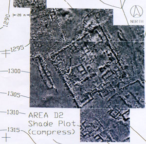 excavation. Bu 70m x 70m büyüklüğündeki şehir yapı adasının dış duvarları yüzeyde görülebilmekle birlikte, jeofiziksel araştırma sonucu içinin de orta kısımda görüşleniki odalı biğna gibi irili ufaklı yapılarla dolu olduğu anlaşılmıştır. Bu jeofiziksel verilerin bilgisayar ortamına aktarılarak rektifiye edilen helyum balonu fotoğrafları ile çakıştırlması sonucu şehrin haritaları elde edilmektedir. Jeomanyetik verilerin güvenilirliği kazı ile denenmiştir |