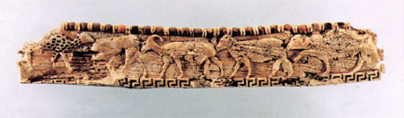 Excavated in 1996, this ivory furniture inlay is embellished with amber beads backed with reflective tin or silver and has traces of gold leaf. The doe, at left, was originally decorated with brightly coloured enamel. This unique piece points to contacts with the west and is an indication of the status and sophisticated taste of the Pterians. It measures 29cm. Conservation was carried out by Simone Korolnik in the Museum of Anatolian Civilisations, Ankara. The photos were taken by Behiç Günel and Hüseyin Şen. 1996 yılı kazılarında ortaya çıkarılan bu fildişi mobilya süsleme parçası, arkalarıı yansıtıcı kalay veya gümüş ile varaklanmış kehribar boncuklar ve yer yer altın varaklarla süslenmiştir. Sol uçta görülen ceylan ise özgün halinde parlak renkli minelerle bezenmiştir. Bu benzersiz buluntu, batı ile yakın ilişkilere işaret etmekte ve Pterialıların gelişmiş zevklerini göstermektedir. Objenin uzunluğu 29 cm'dir. Objenin konservasyonunu Ankara Anadolu Medeniyetleri Müzesi' nde Simone Korolnik tarafından yürütülmüş, fotoğraflar ise Behiç Günel ve Hüseyin Şen tarafından çekilmiltir. |