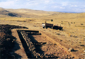local workmen under the superision of expedition staff and students. Yapılan deneme kazıları manyetik haritaların doğruluğunu kanıtlamıştır. Bunlar açık bir biçimde, şehrin bilinçli olarak yakıldığını göstermiş ve şehir sakinlerinin zenginlik ve medeniyet düzeyleri ile ilgili önemli veriler ortaya koymuştur. Döşemeler sıkıştırılmış toprak olup, açık alanların büyük kısmı resimde görüldüğü gibi taş kaplanmıştır. Deneme kazısı çalışmaları Yozgat Müzesi Müdürü Musa Özcan ile ortak yürütülmüş ve araştırma ekibi ile öğrencilerin denetiminde işçilerce yapılmıştır. |
