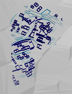The drawing draped over a three-dimensional GPS simulation of the topography.