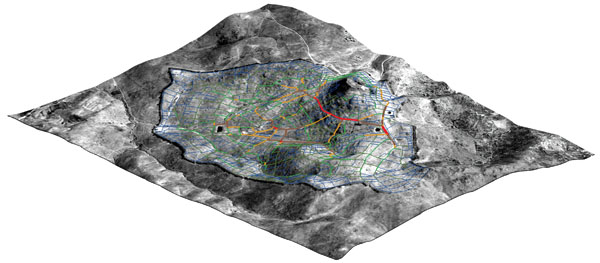 Figure 23: Satelite image and roads over a Digital Terrain Model (DTM). Şekil 23: Dijital Arazi Modeli üzerine oturtulmuş uydu görüntüsü ve yollar.
