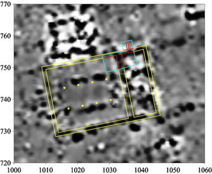 reconstructed in yellow.Test trench 22 is in blue, excavated walls in