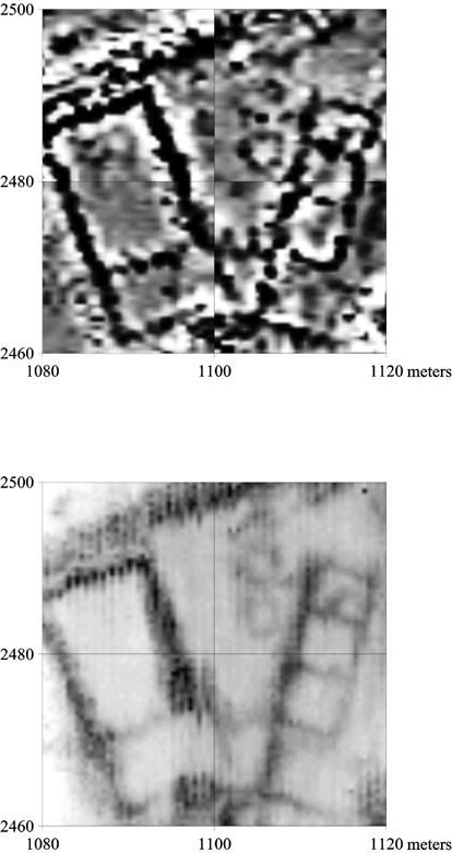 a large hall and anteroom at left and a row of four cells at right. - Şehrin kuzey ucunda yer alan 40x40m boyutlarındaki bir yapı adası, farklı jeofiziksel yöntemlerle yapılacak deneyler için uygun görülmüştür. Hem gradyometre (a), hem de elektromanyetik indüksiyon (b) yöntemleriyle yapılan yüzey araştırmalarında solda büyük bir salon ve buna ait ön oda ile sağda dört hücreden oluşan bir oda dizisi görünmektedir. |