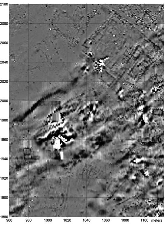 into open spaces. - Sığ bir vadide kuzeydoğu ve güneybatıya bakan şehir blokları ile belki de su temin elemanları bulunan alanın jeomanyetik yüzey araştırması. Jeoloji bazı gariplikler gösterir, aşağıda ortada yer alan silik yapıların açık alanlara baskın çıkmasında da bu gözlenmektedir. |