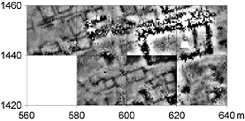 - Resistivity map of the “temple” and its environs. - Saray yapı grubu ve çevresinin direnç haritası.