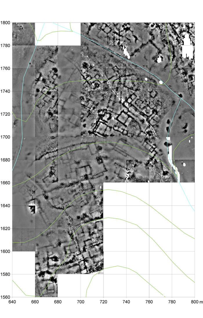 The central portion of the resistivity survey, including the structures that were partially excavated later in the 2003 season. Direnç yöntemiyle yüzey araştırması yapılan alanın, 2003 sezonunda daha sonra kısmen kazılan yapıları da içeren orta bölümü. |
