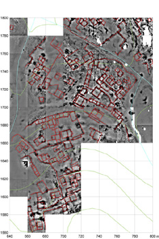 Direnç yöntemiyle yüzey araştırması yapılan alanın orta bölümü. Toprak altında gömülü bulunan duvarlar kırmızı renkle işaretlenmiştir.