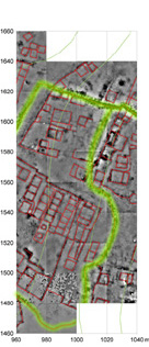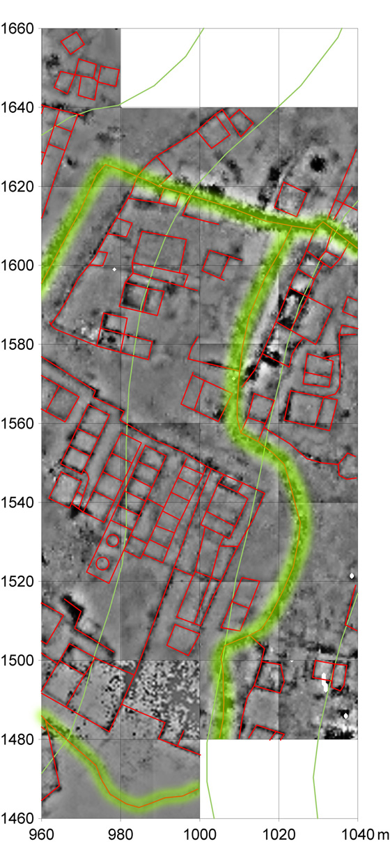 The eastern end of the resistivity survey with buried walls shown in red and later enclosure walls in green. Direnç yöntemiyle yüzey araştırması yapılan alanın doğu ucu. Toprak altında gömülü bulunan duvarlar kırmızı, yerleşim sonrası döneme ait duvarlar ise yeşil renkle işaretlenmiştir. |