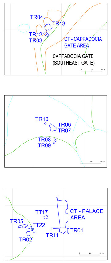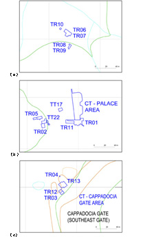 Trenches in (a) the lower central area, (b) the Palace Complex area and (c) at the Cappadocia Gate.