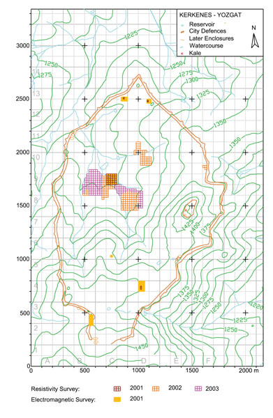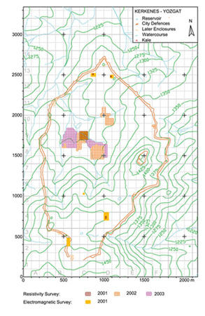 Figure 3: Progress map of the Resistivity Survey. Şekil 3: Direnç yöntemi ile yüzey araştırmasının ilerleyişini gösteren harita.