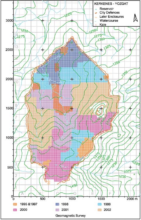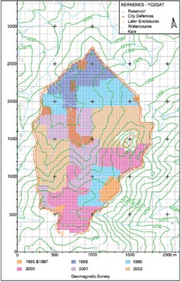 the southern extremity. - Kerkenes'teki jeomanyetik yüzey araştırmasının ilerleyişini gösteren harita. 2002 yılının sonunda, Kale'deki kayalık alanlar ve güney uçtakı Bizans yerleşimi (Kiremitlik) dışında Demir Çağı şehrinin her yerindeki çalışmalar tamamlandı. |