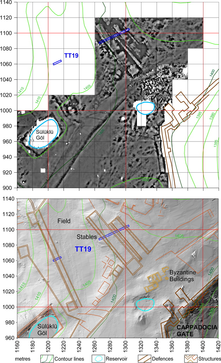 (a) Electrical resistance survey showing the long structures thought to be stables and test trench TT19. (b) GPS map of the terraces overlaid with plans of visible remains and interpretation of geophysical surveys. Test trench TT19 was dug across the structures in 1996. (a) Ahır oldukları düşünülen uzun yapıları ve Test Açması TT19u gösteren elektrik direnç yüzey araştırması. (b) Yüzeyde görülebilen ögeler ve jeofiziksel yüzey araştırması tahmin planlarının, kent teraslarına ait GPS haritası ile çakıştırılması. Test Açması TT19, 1996da bu yapılar boyunca açılmıştır. |