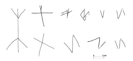 - The ten marks that were incised on the pottery found during the 2000 season. - 2000 yılında keramik kapların üzerine çizilmiş olarak bulunan on adet işaret.