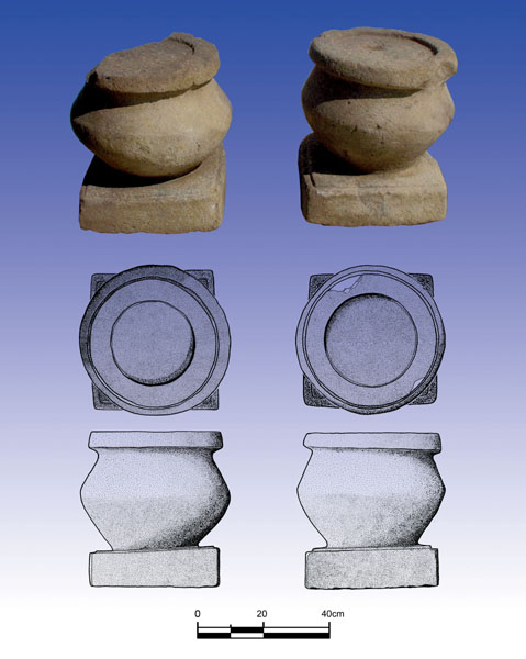 Figure 8: The ornate sandstone bases with post-conservation drawings. Şekil 8: Bezemeli kumtaşı kaideler ile koruma çalıþması sonrası yapılan çizimleri.